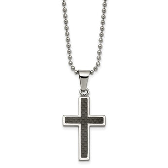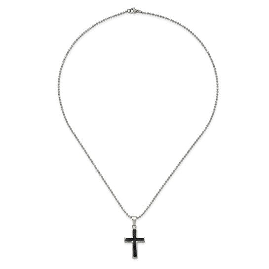 Stainless Steel with Black Carbon Fiber Inlay Cross Pendant on 22" Ball Chain