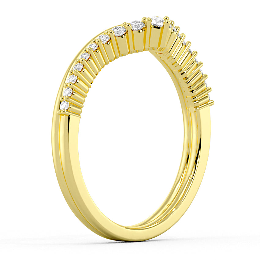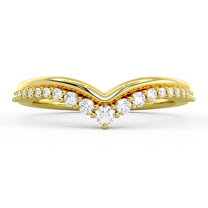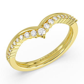 Chic, sculptural, and made to stand out. This double-row chevron band features a graduated sweep of diamonds that draws your eye right to the center, and creates a naturally flattering, elongating effect on the finger. The layered design gives it that stacked look without the effort, blending a polished gold contour with a row of shimmering diamonds for added depth and dimension. It’s the kind of piece that feels just as right paired with an engagement ring as it does styled solo.