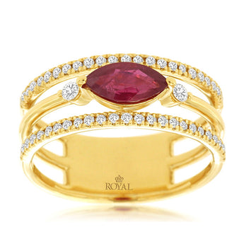 14 Karat Yellow Gold Ruby and Diamond Three-Row Fashion Ring