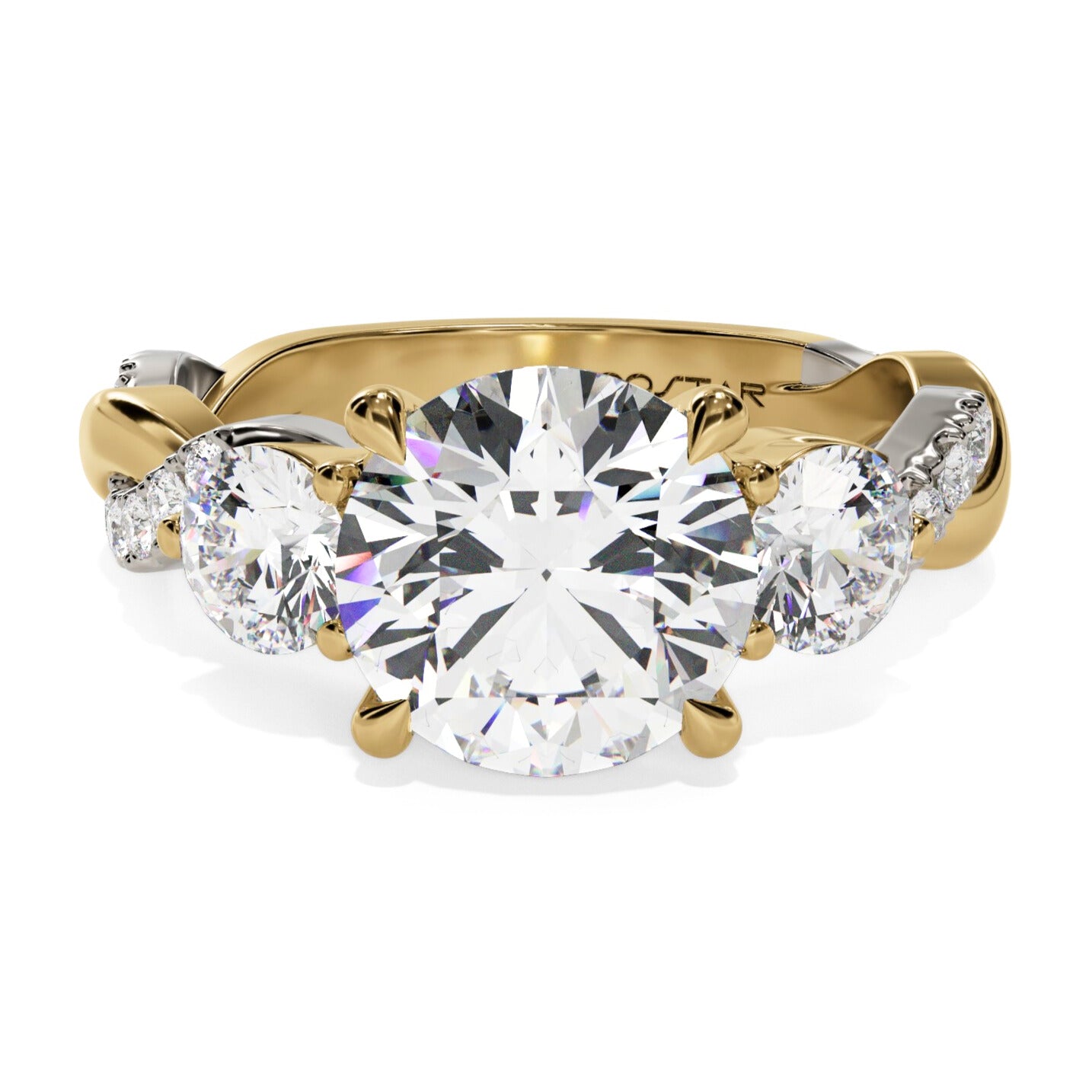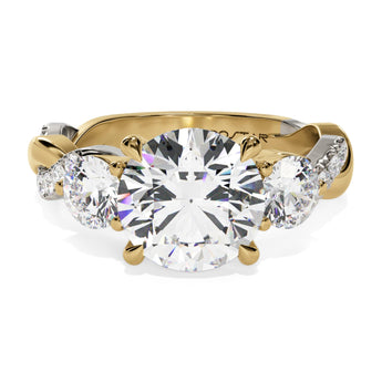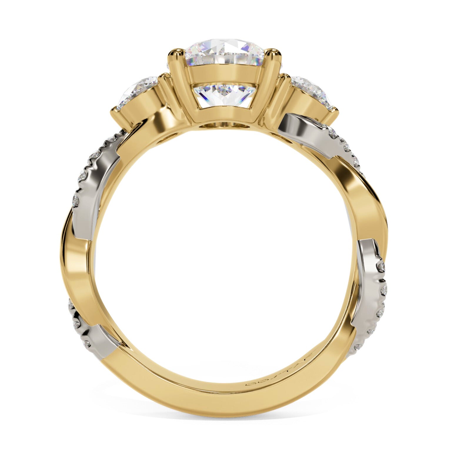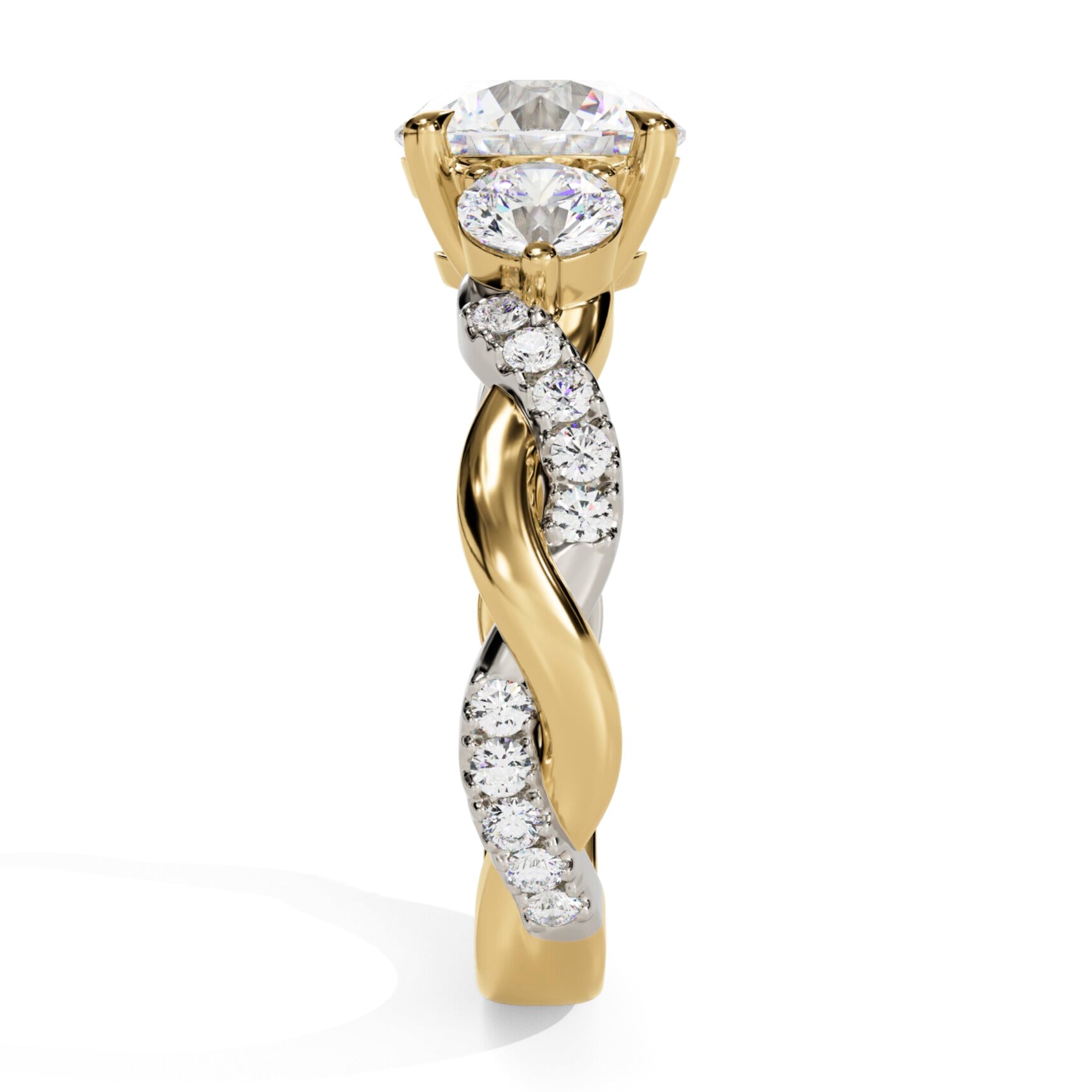 This engagement ring is all about movement, brilliance, and meaning. A bold round center is embraced by two sparkling side stones in the classic three-stone style, symbolizing your past, present, and future together. The band steals the show with a two-tone spiral design: intertwining ribbons of yellow and white gold, one polished and the other diamond-lined, representing two lives beautifully woven into one.