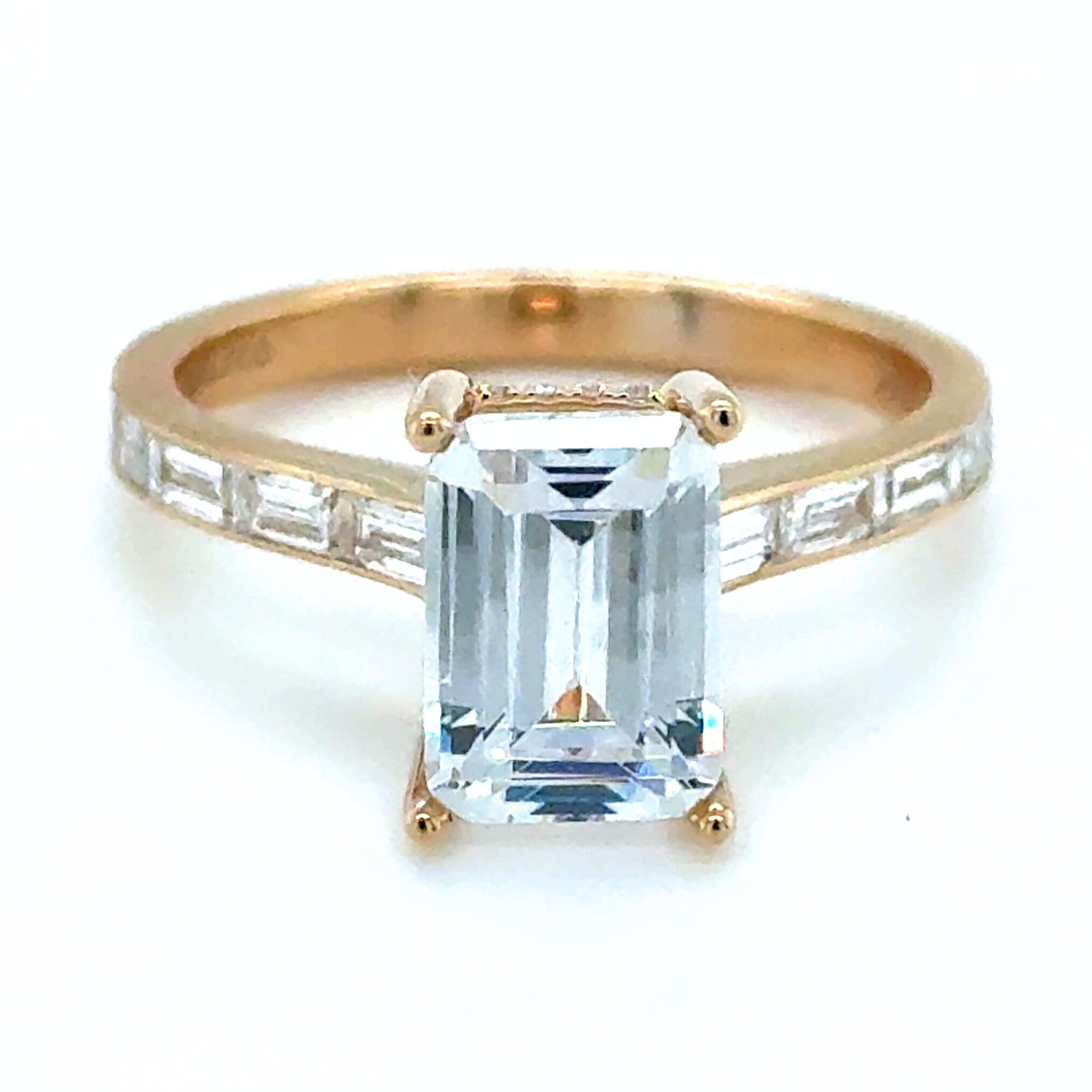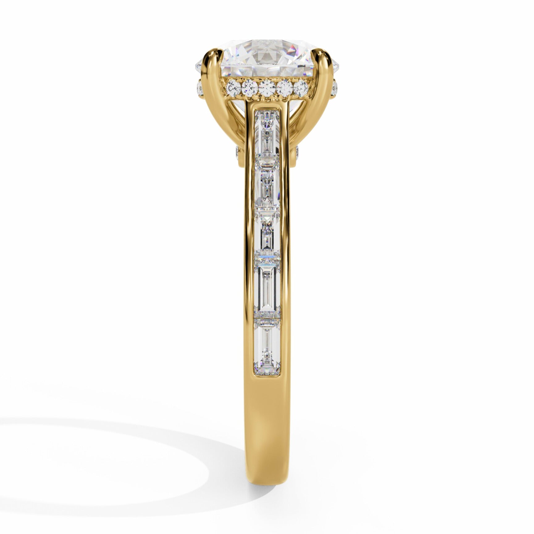This engagement ring puts your emerald-cut stone center stage, framed by a hidden halo of glittering diamonds that catch the light from every angle. A peek from the side reveals a surprise diamond tucked beneath the setting- a secret sparkle just for you. Sleek baguette diamonds flow down the band in polished channel walls, adding vintage-inspired charm with modern shine. Pair it with the matching baguette wedding band for a timeless set that feels as unique as your love.