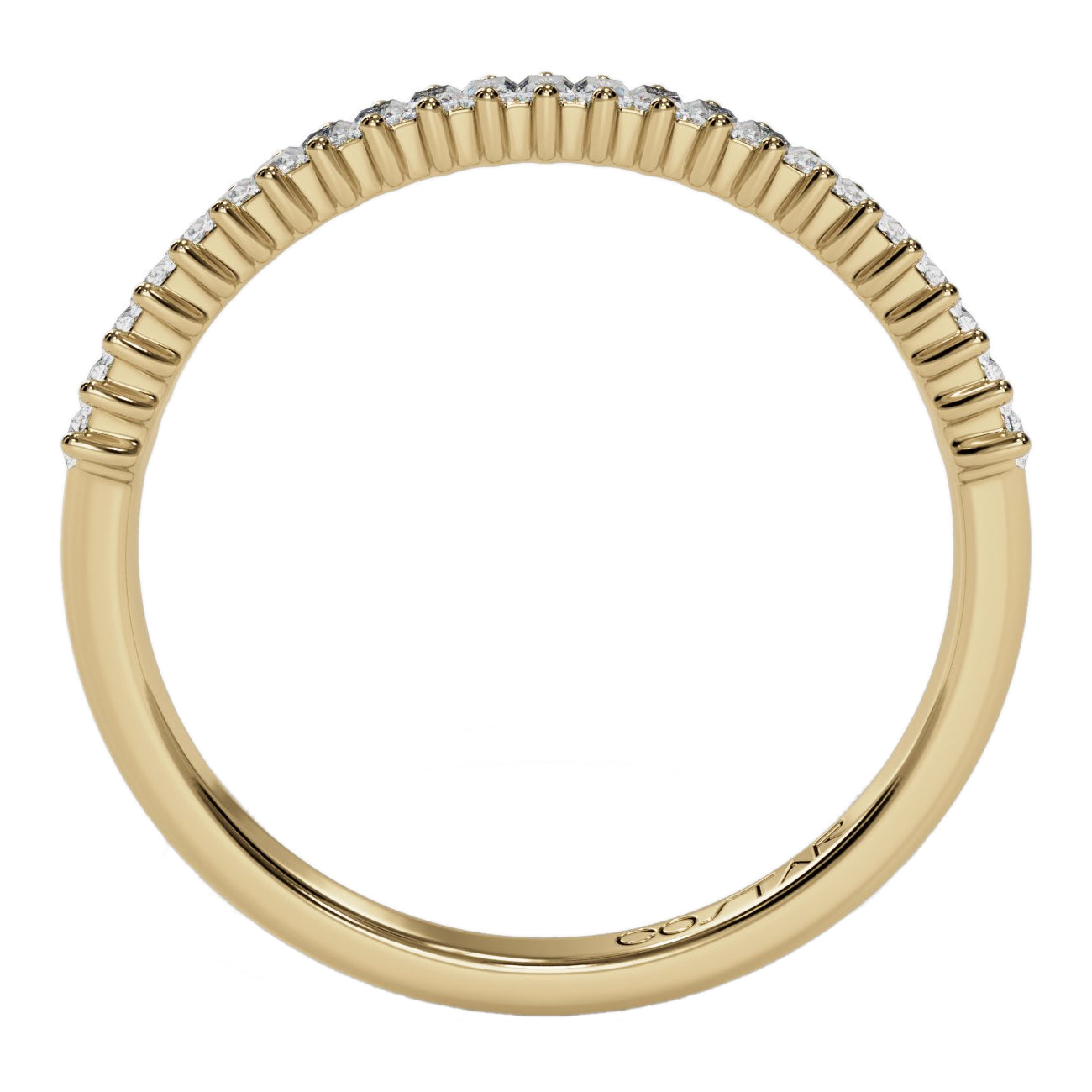 Shining baguette diamonds are prong-set atop luxurious yellow gold in this unique band. The vertically set diamonds catch the light and give a modern edge to a sophisticated style.