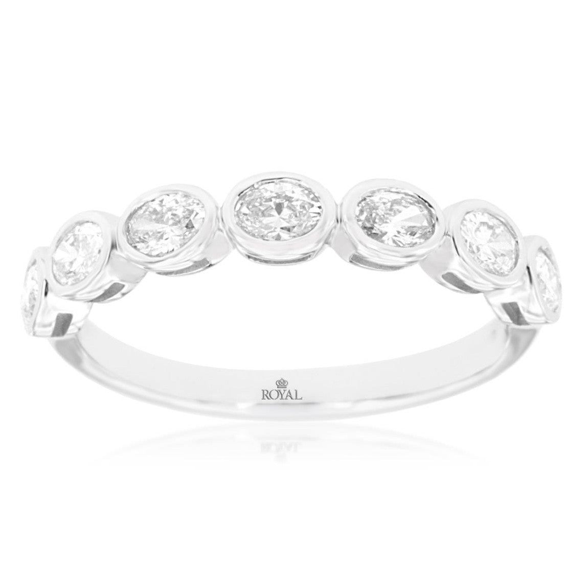 This exquisite band showcases a stunning array of oval diamonds, renowned for their timeless and romantic allure, nestled in sleek white gold bezels. The smooth bezel settings not only protect each diamond, but also offer up a contemporary edge to the design. With its unique east-west orientation, this band radiates effortless luxury—a perfect choice for those who value sophistication and refined design.