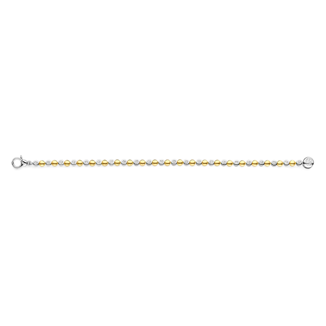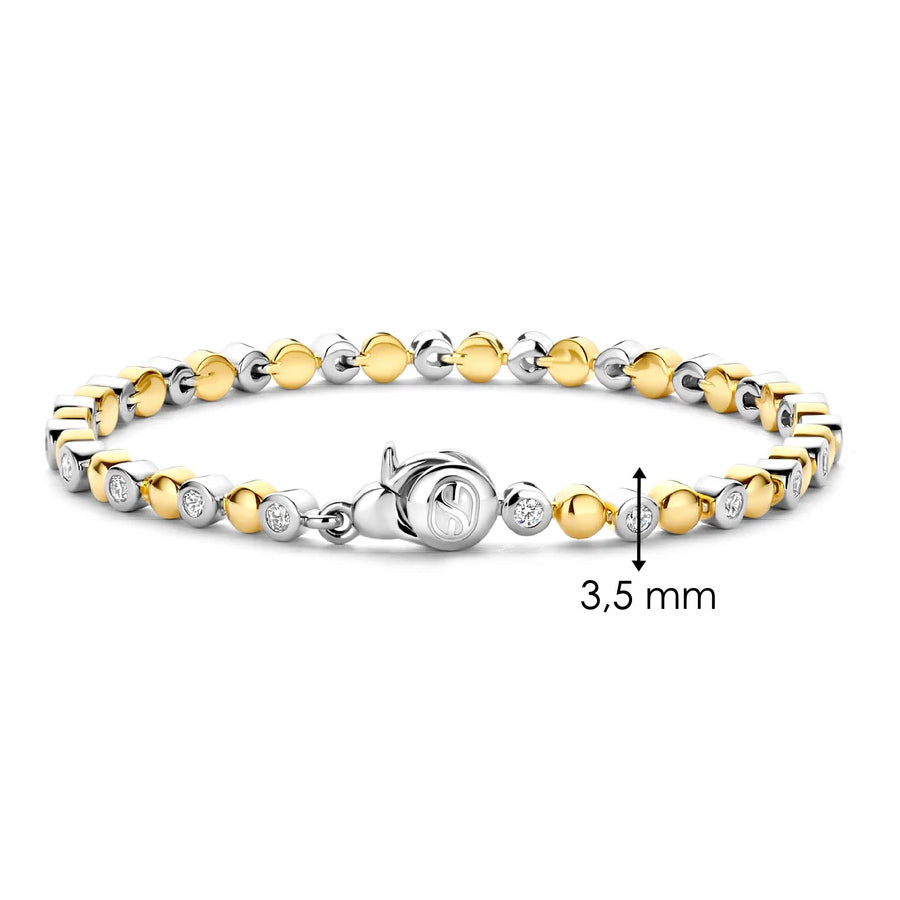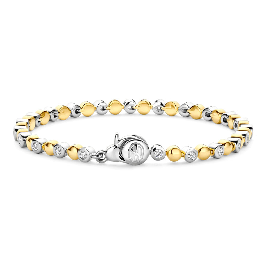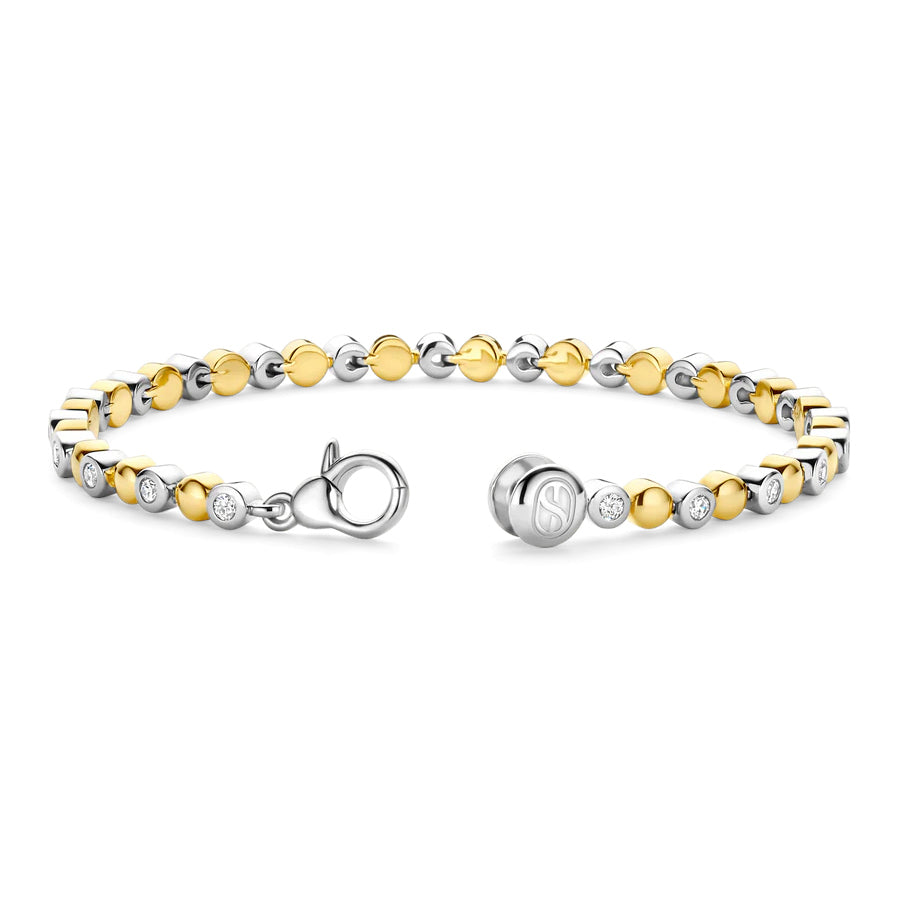 Embrace the warmth of summer with this alternating beaded bezel fashion bracelet, a modern interpretation of timeless design. Crafted from premium sterling silver, this beautiful bracelet features a captivating interplay of yellow gold-plated half-bubble domes alternating with sparkling white cubic zirconia set in silver settings. The golden hues evoke the glow of a summer sunset, creating a piece that is both elegant and effortlessly chic. Crafted with care for sensitive skin, this nickel-free and hypoallergenic bracelet ensures lasting comfort and quality.