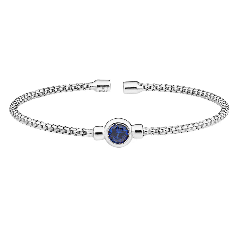 Sterling Silver Bezel-set Simulated Sapphire Rounded Box Link Flexi Fashion Cuff Bracelet