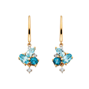 These captivating yellow gold color cluster earringgs present a vibrant symphony of color with an London, Swiss, and sky blue topaz gemstones, creating a truly striking color palette. These gems are beautifully accented by sparkling diamonds. Adding graceful movement and brilliance, an articulated diamond drop dangles elegantly at its base. Matching pendant is available, too!