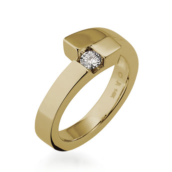 Step into timeless elegance with this striking ring from John Atencio's Orion Collection. Crafted in warm 14-karat yellow gold, this piece showcases a single brilliant diamond set within a modern, architectural bezel. The angular design contrasts beautifully with the round diamond, creating a harmonious balance between bold structure and classic refinement. This ring is a testament to John Atencio's signature style, blending sleek lines with captivating simplicity. Perfect for the woman who values both contemporary design and timeless luxury.