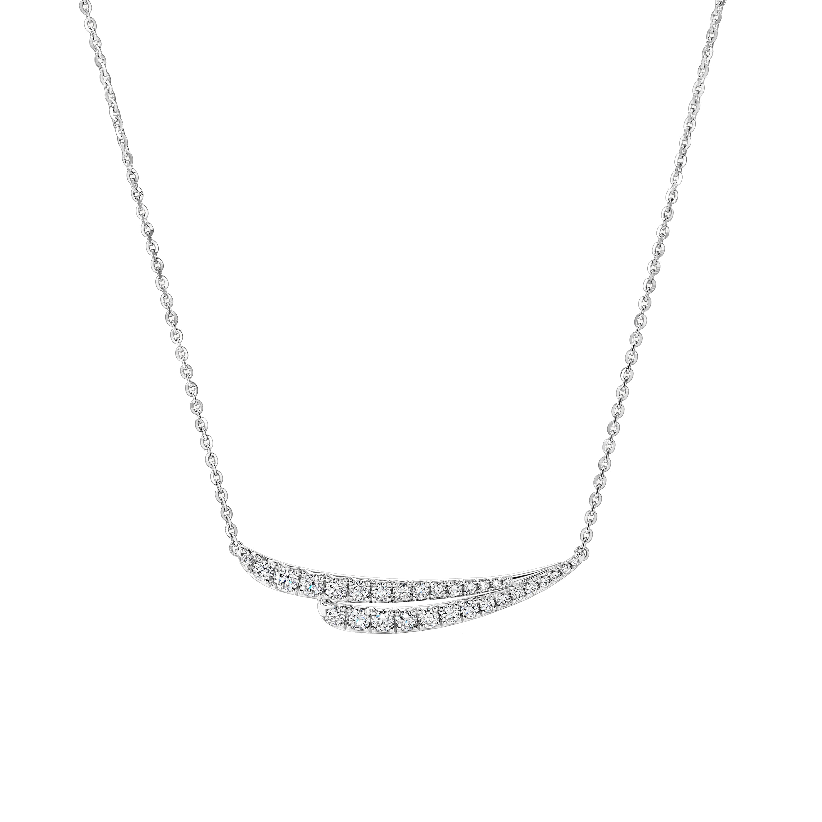 The Vela French Cut Pavé Diamond Pendant Necklace immediately catches the eye with its elegant design. It features two overlapping diamond lines that mimic the graceful curves of the neck.