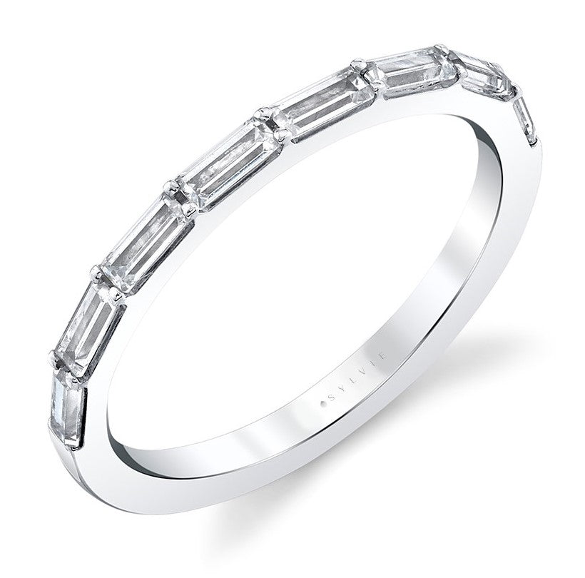 This sleek baguette wedding band is a timeless piece you’ll enjoy for decades to come. An array of seven gorgeous baguette diamonds, renowned for their sleek allure, adorn the top of this band. Gorgeous alone, stacked with other baguette bands, or next to an engagement ring to make a vintage-inspired wedding set. Also available in eternity style!