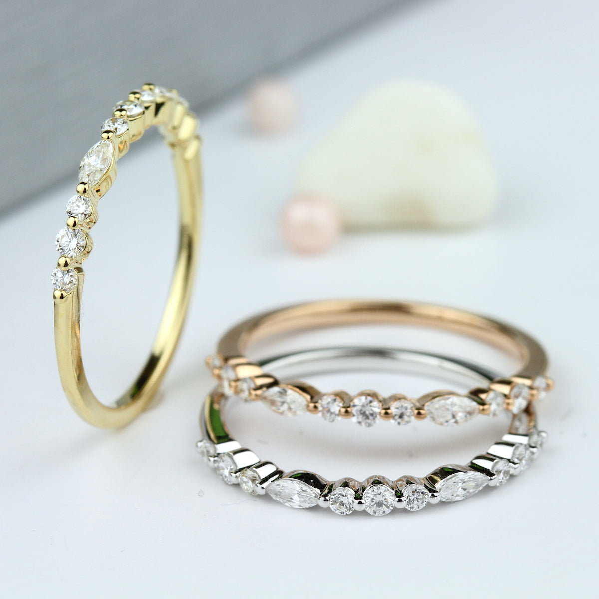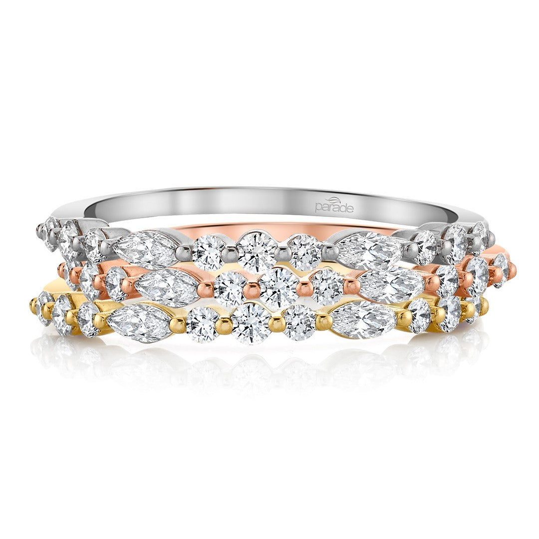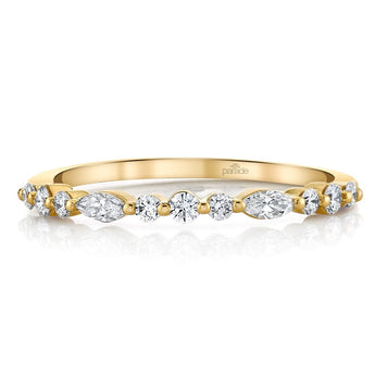 A wave-like pattern of marquise and round diamonds adorn a lustrous gold band in a unique single-prong setting. This contemporary beauty effortlessly turns heads as part of a sparkling ring stack or worn solo. It also serves as a stunning companion to an engagement ring, adding some modern flair to your wedding set.