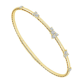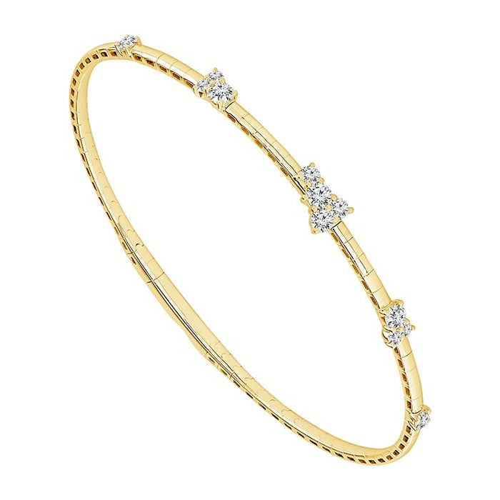 Indulge in the sheer luxury modern sparkle with effortless flexibility. Expertly crafted in yellow gold, this bracelet utilizes a clever titanium filament core that ensures both flexibility and unparalleled comfort. Clusters of round brilliant diamonds are artfully spaced along the bangle, creating a look that’s fresh, contemporary, and endlessly chic. Stunning on its own yet made to mix, this piece is perfect for layering - so go ahead! Mix and match to create a dazzling look that's all your own.