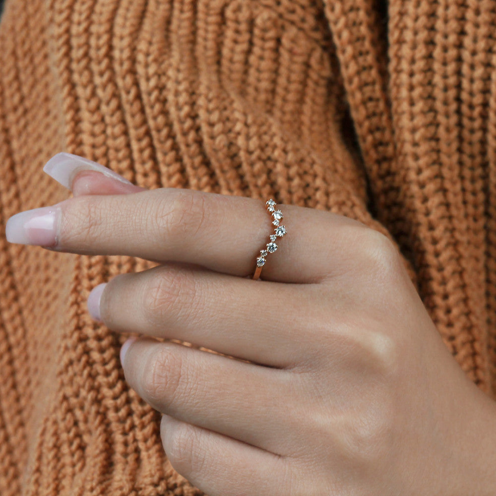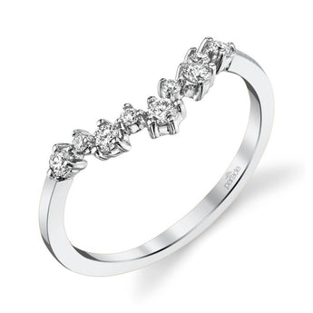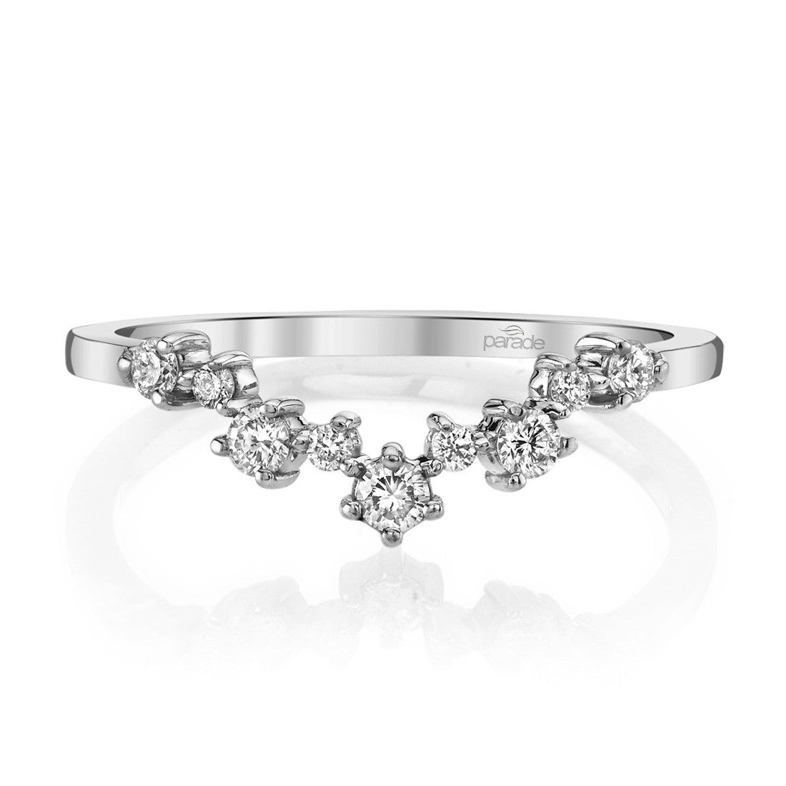Large and small diamonds sparkle along a chevron shaped band of gleaming gold in an alternating pattern. Pair this alluring band alongside your engagement ring to add contemporary flair to your wedding set. Add it to a ring stack or wear this beauty alone to make a shining fashion statement.