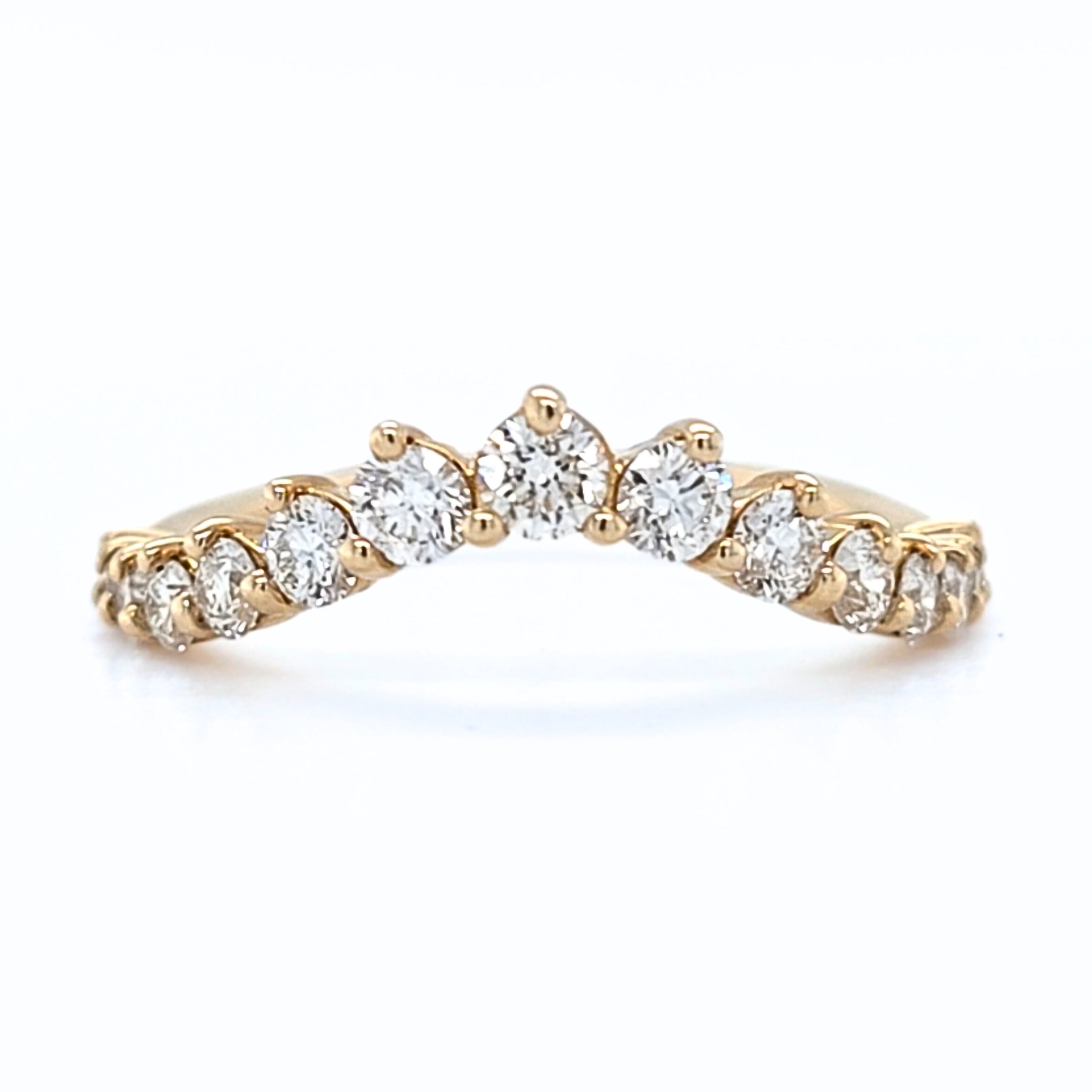 A sprinkling of round brilliant diamonds creates this exceptional sparkler. Graduated diamonds cascade down its contoured shape, naturally drawing the eye towards the center. The curve of this gorgeous band allows it to pair effortlessly with a wide array of engagement ring styles, enhancing their beauty with ease.