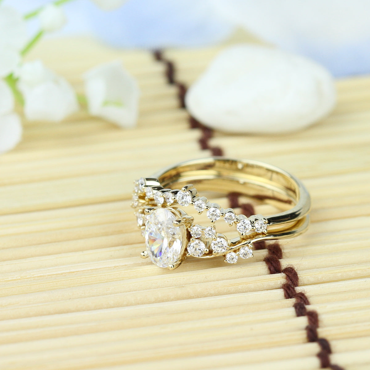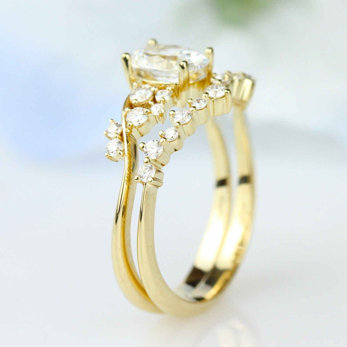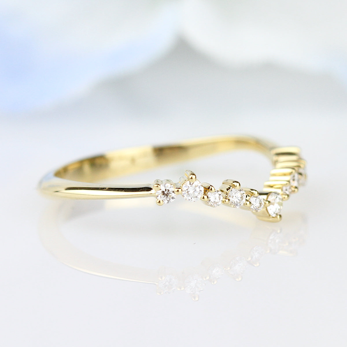 Radiating with refreshing effervescence, this captivating ring features golden waves of gold budding with brilliant round diamonds. An embodiment of timeless charm, this design fits perfectly alongside its matching engagement ring and captures the essence of elegance and beauty.
