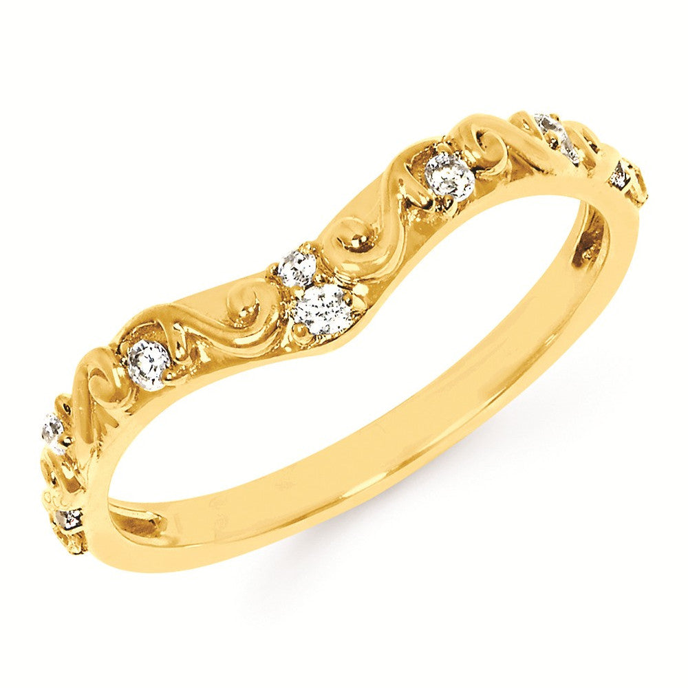Graceful curves meet romantic charm. This contour wedding band features delicate scrollwork detailing, accented by round diamonds that twinkle with every movement. The vintage-inspired design adds an elegant flourish, whether worn alone or paired with your engagement ring for a beautifully tailored fit.