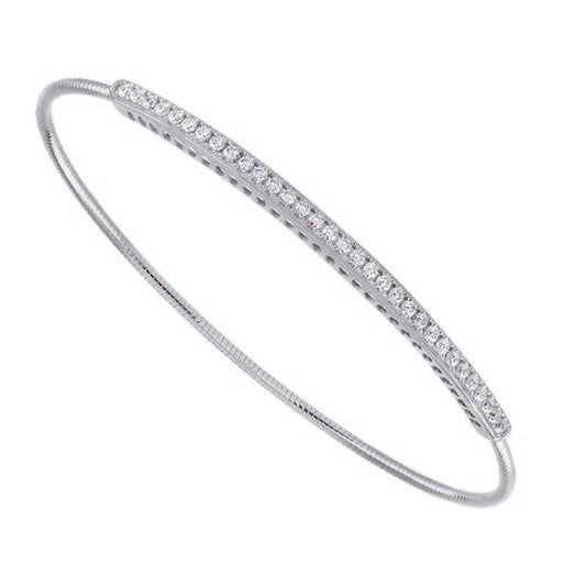 Indulge in the luxury of a diamond bangle with the ease of a slip-on bracelet. This timeless style utilizes a titanium filament core that allows it to effortlessly expand over the hand, fitting most wrists. A lovely white gold bar studded with sparkling diamonds shines at the center of this streamlined, modern design. Wear this innovative piece as your everyday signature bracelet or mix and match with others to elevate your arm stack to the next level.