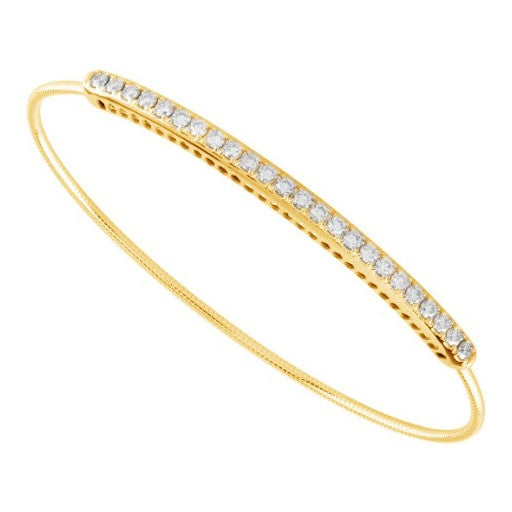 Indulge in the luxury of a diamond bangle with the ease of a slip-on bracelet. This timeless style utilizes a titanium filament core that allows it to effortlessly expand over the hand, fitting most wrists. A lovely yellow gold bar studded with sparkling diamonds shines at the center of this streamlined, modern design. Wear this innovative piece as your everyday signature bracelet or mix and match with others to elevate your arm stack to the next level.