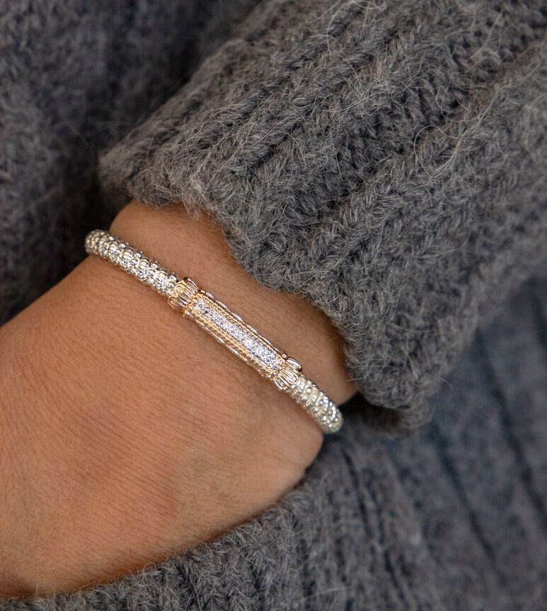 Fine sterling silver and 14K gold complement one another perfectly on our stackable bangle bracelet—striking on its own or as part of a stacked look. Designed with a Moiré Beaded pattern, diamonds illuminate the elegant setting with extra sparkle.