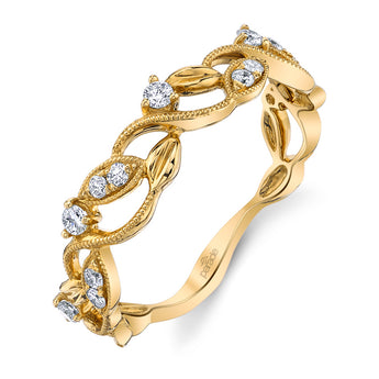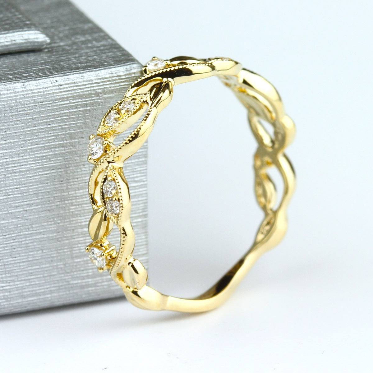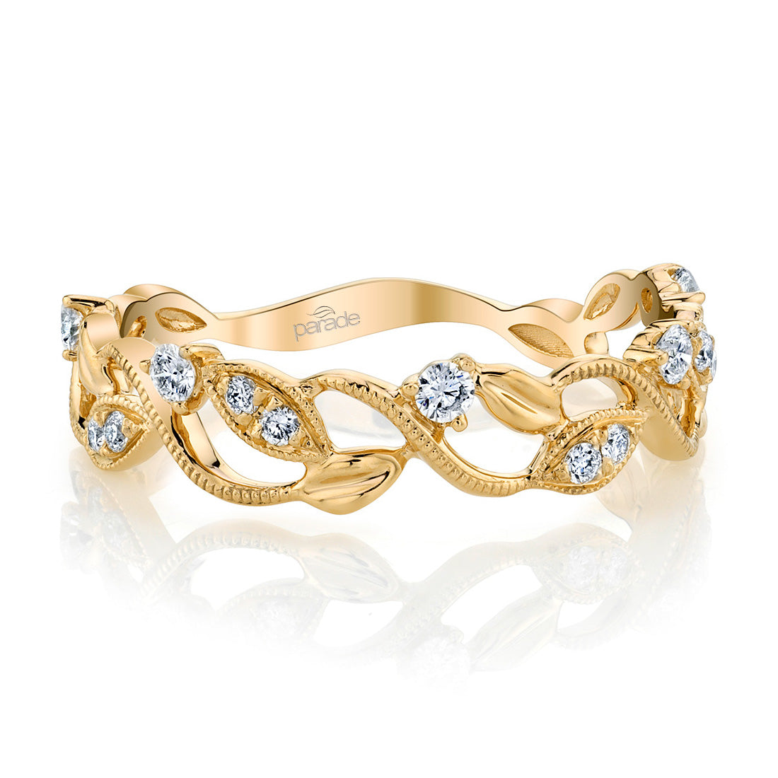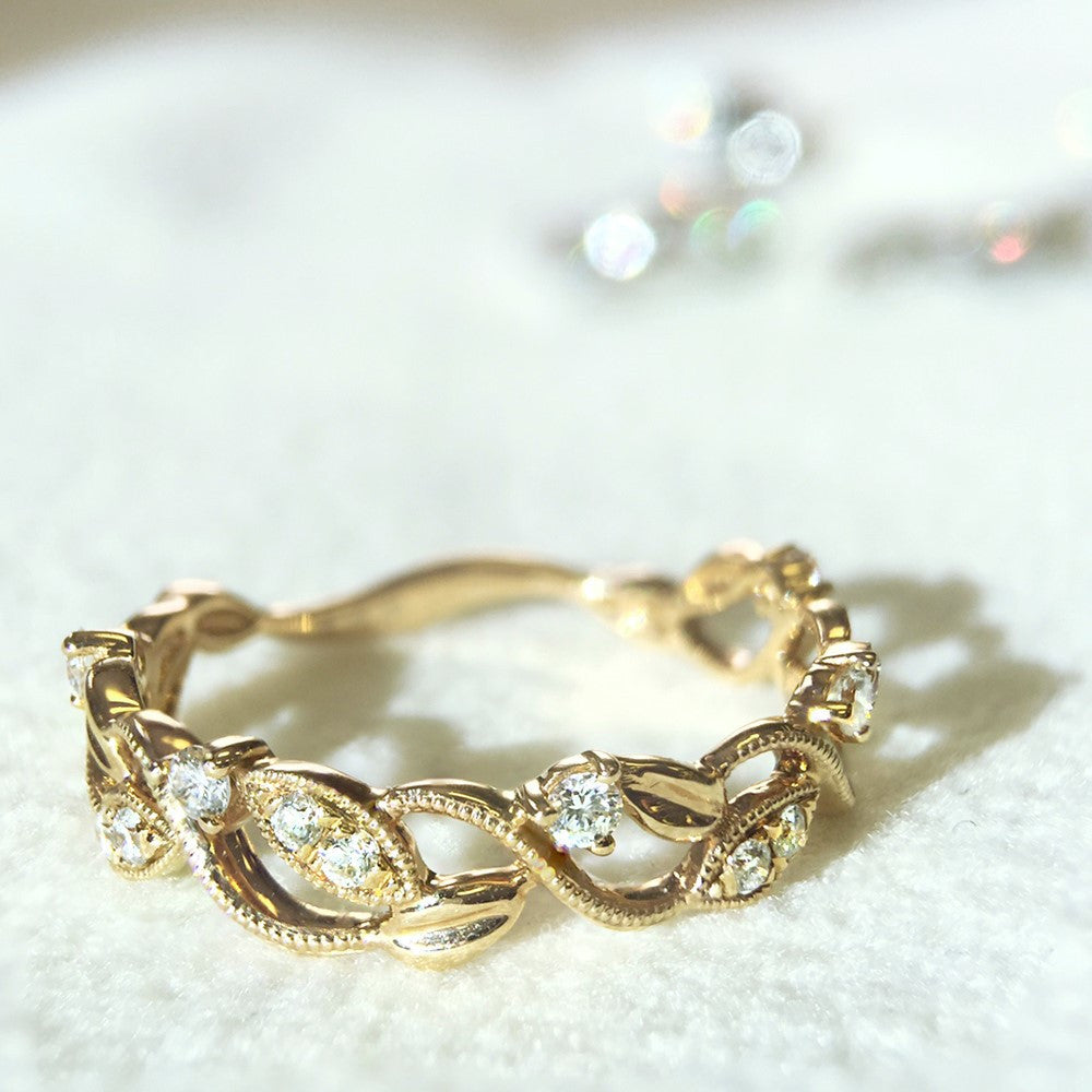 Dive into the enchanting beauty of a garden in full bloom with this exquisite fashion piece. Two intertwining bands of gold mimic the graceful twists of vines, with meticulous milgrain detailing adding a touch of vintage charm. Delicate leaf shapes adorned with round diamonds decorate the vines and sparkle like drops of dew in the morning sun. Carry a touch of nature's elegance with you wherever you go!