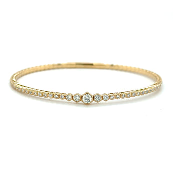 Sleek and chic, this diamond flexi bangle brings modern edge to your bracelet stack. Crafted in radiant yellow gold, this bracelet boasts a clever titanium filament core that ensures both flexibility and unmatched comfort. A stream of bezel-set diamonds shimemrs around the wrist. At the center, hexagon shaped bezels frame five graduated diamonds, creating a bold focal point. Whether worn solo or stacked, this piece adds geometric sparkle to every look.