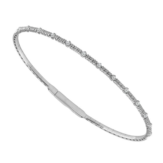 Indulge in vintage-inspired luxury with this diamond flexi bangle bracelet. Crafted in luxuriously cool white gold, this bracelet boasts a clever titanium filament core that ensures both flexibility and unmatched comfort. Thirteen evenly spaced round brilliant diamonds grace the bangle's top, adding dots of glamour to its textured design. Try pairing it with other bangles in your collection for a truly dazzling effect!