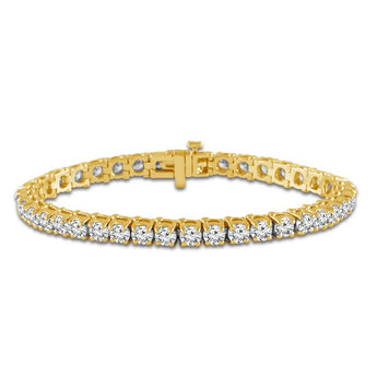 Get ready to turn heads with the eternal sparkle of this classic lab-grown diamond tennis bracelet. Thirty-nine round brilliant lab diamonds dazzle in a continuous line, creating a radiant display of sparkle. Crafted in rich yellow gold, it's the kind of piece that says, 'I'm here to have a good time and look fabulous doing it!' Whether you're out for a casual coffee or attending a glamorous gala, this bracelet elevates your style from zero to bling in a snap.