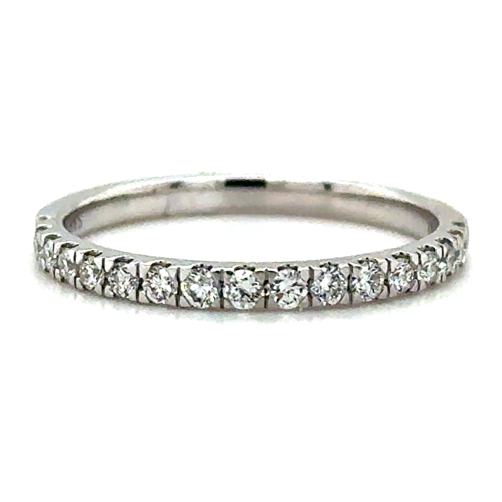 This stunning classic wedding band features shimmering diamonds cascading halfway down its shank. Rock is solo, or pair alongside a solitaire engagement ring for an elegant and glamorous wedding set.
