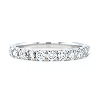 This luminous band showcases a row of eleven glittering diamonds extending halfway around the finger. An ultimate team player, this beauty plays well with a variety of engagement ring styles, stackable bands, or is ready to rock a solo debut too!