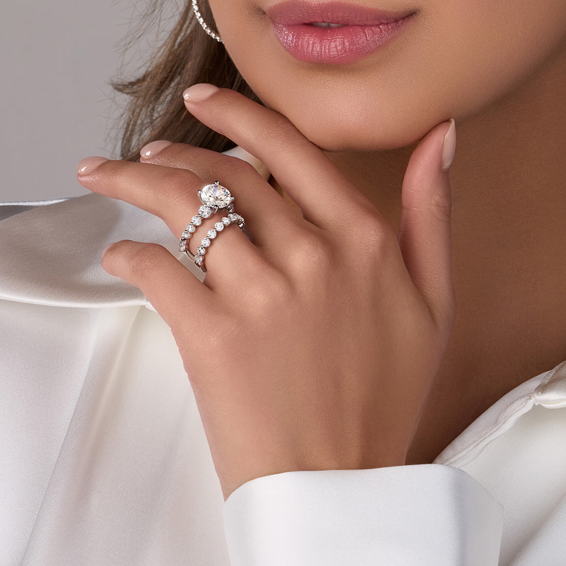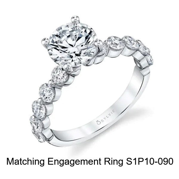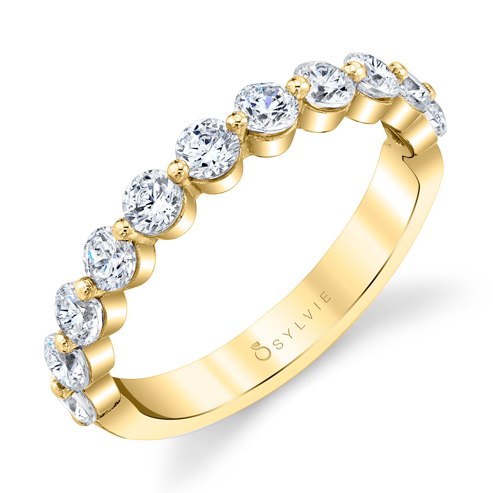 This dazzling stackable wedding band features a row of eleven glittering round diamonds flowing down the shank in a unique shared prong setting. Pair it with its matching single-prong engagement ring for a showstopping wedding set. Or wear on its own as your new sparkling style staple!