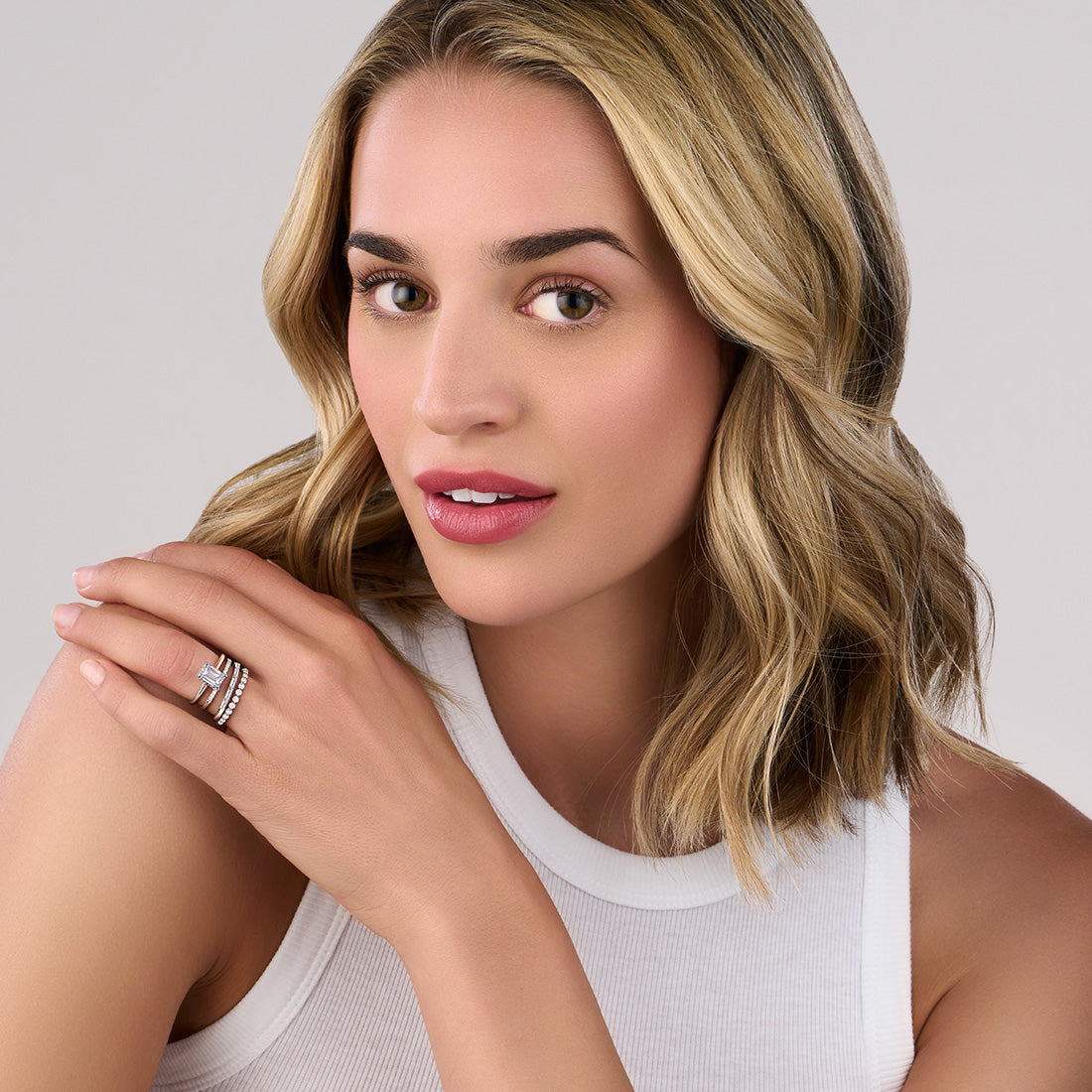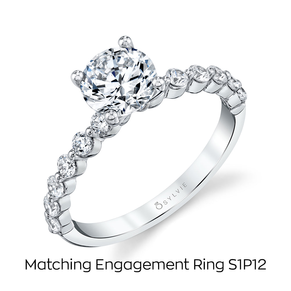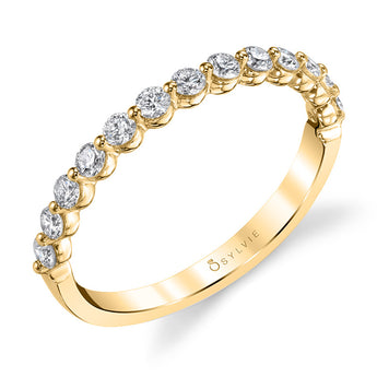 This gorgeous stackable wedding band features a row of thirteen glittering round diamonds in a unique shared prong setting—lending modern flair. Pair it with its matching single-prong engagement ring for a showstopping wedding set. Or wear on its own as your new sparkling style staple!