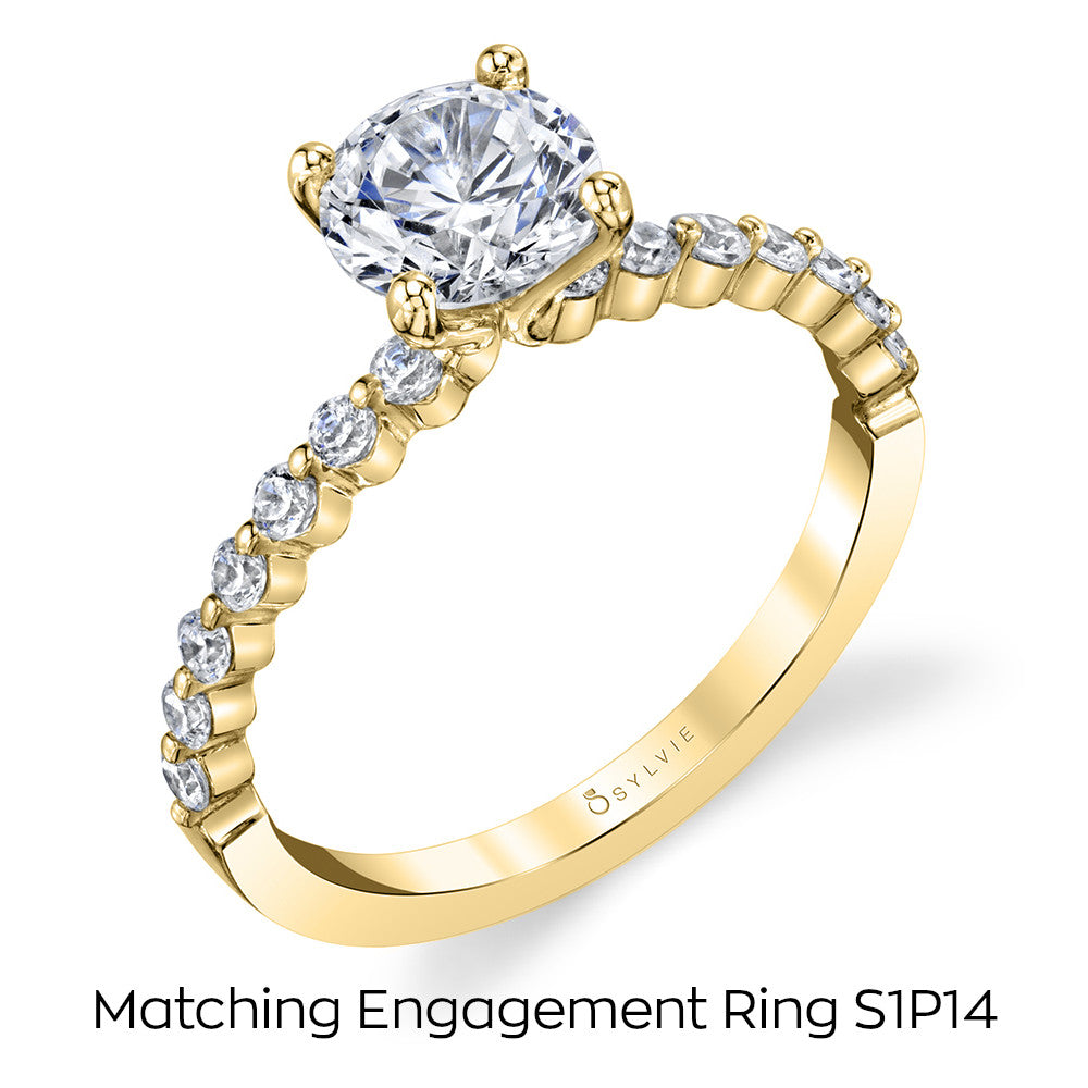 This gorgeous stackable wedding band features a row of fifteen glittering round diamonds in a unique shared prong setting—lending modern flair. Pair it with its matching single-prong engagement ring for a showstopping wedding set. Or wear on its own as your new sparkling style staple!