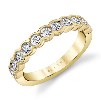 This exquisite band showcases a stunning array of brilliant round diamonds, renowned for their timeless allure, nestled in sleek yellow gold bezels. The smooth bezel settings not only protect each diamond, but also offer up a contemporary edge to the design. This band radiates effortless luxury—a perfect choice for those who value sophistication and refined design.