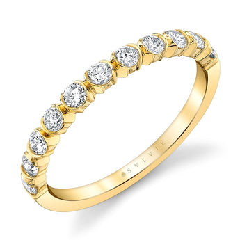 This exquisite band showcases a stunning array of brilliant round diamonds, renowned for their timeless allure, nestled in unique half bezel settings. The half bezels delicately hold each diamond securely, offering up a safe, yet radiant look. Secure and stunning this band is perfect for those who appreciate beauty in the details.