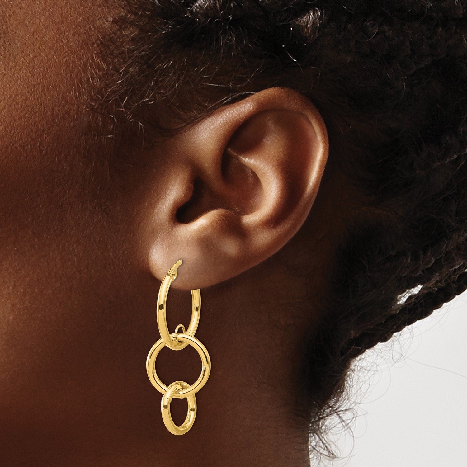 Feel refined yet playful with these modern hoop earrings of interlocking gold circles. Polished to a luxurious shine, these dangling earrings add movement and glamour to everyday looks.