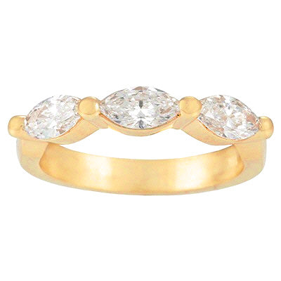 Crafted in warm yellow gold, this three-stone band features marquise diamonds set east-west across the finger for a fresh, modern silhouette. The single prong setting creates a contemporary twist on classic elegance that lets each diamond take center stage, while keeping the design sleek and refined. With over a carat of brilliance, this band makes a statement whether worn solo or stacked alongside your other favorites.