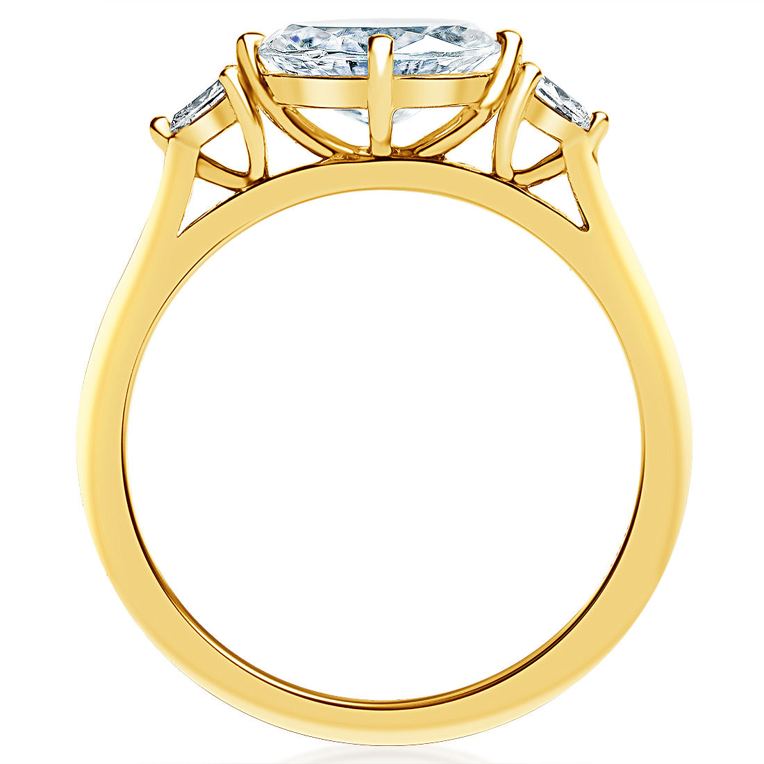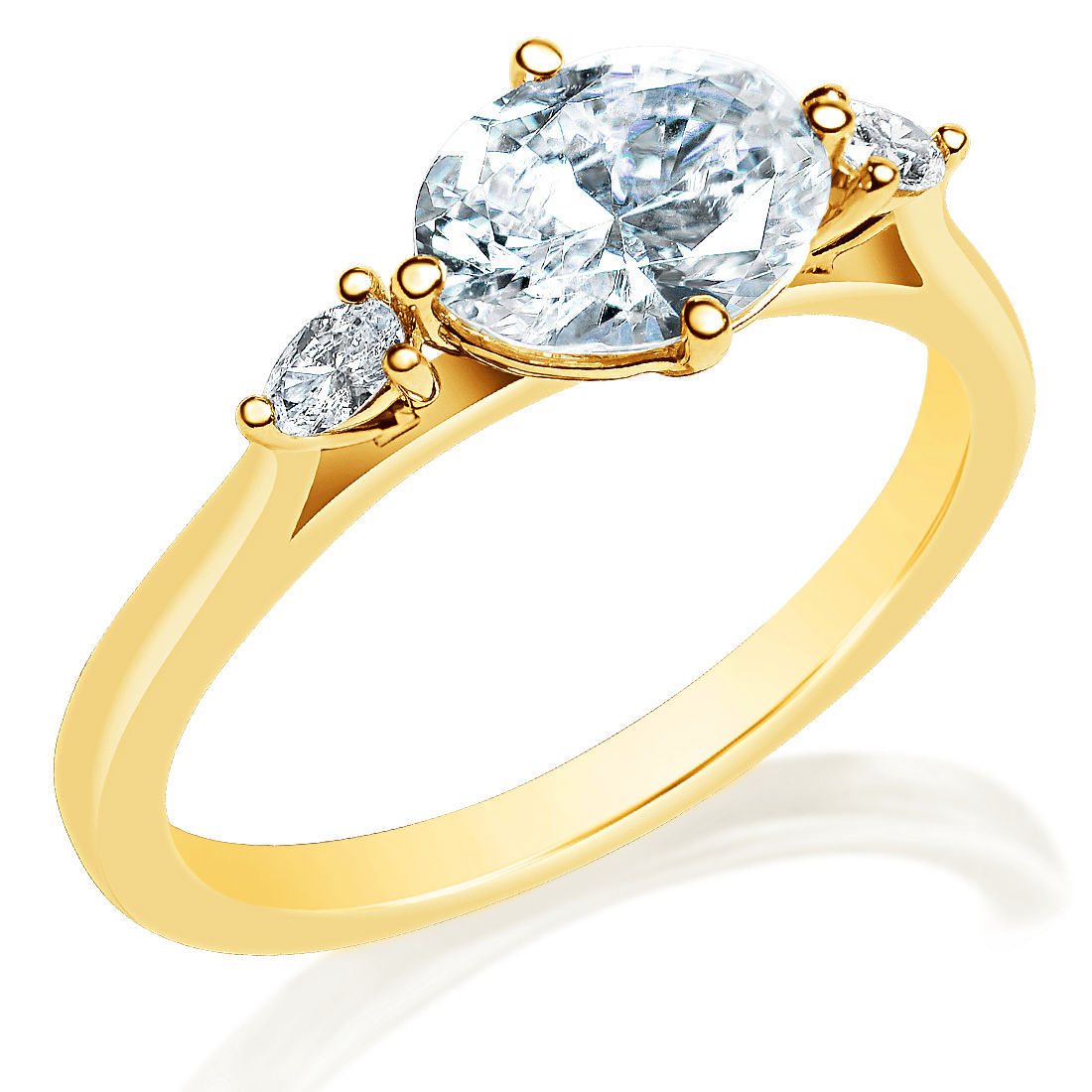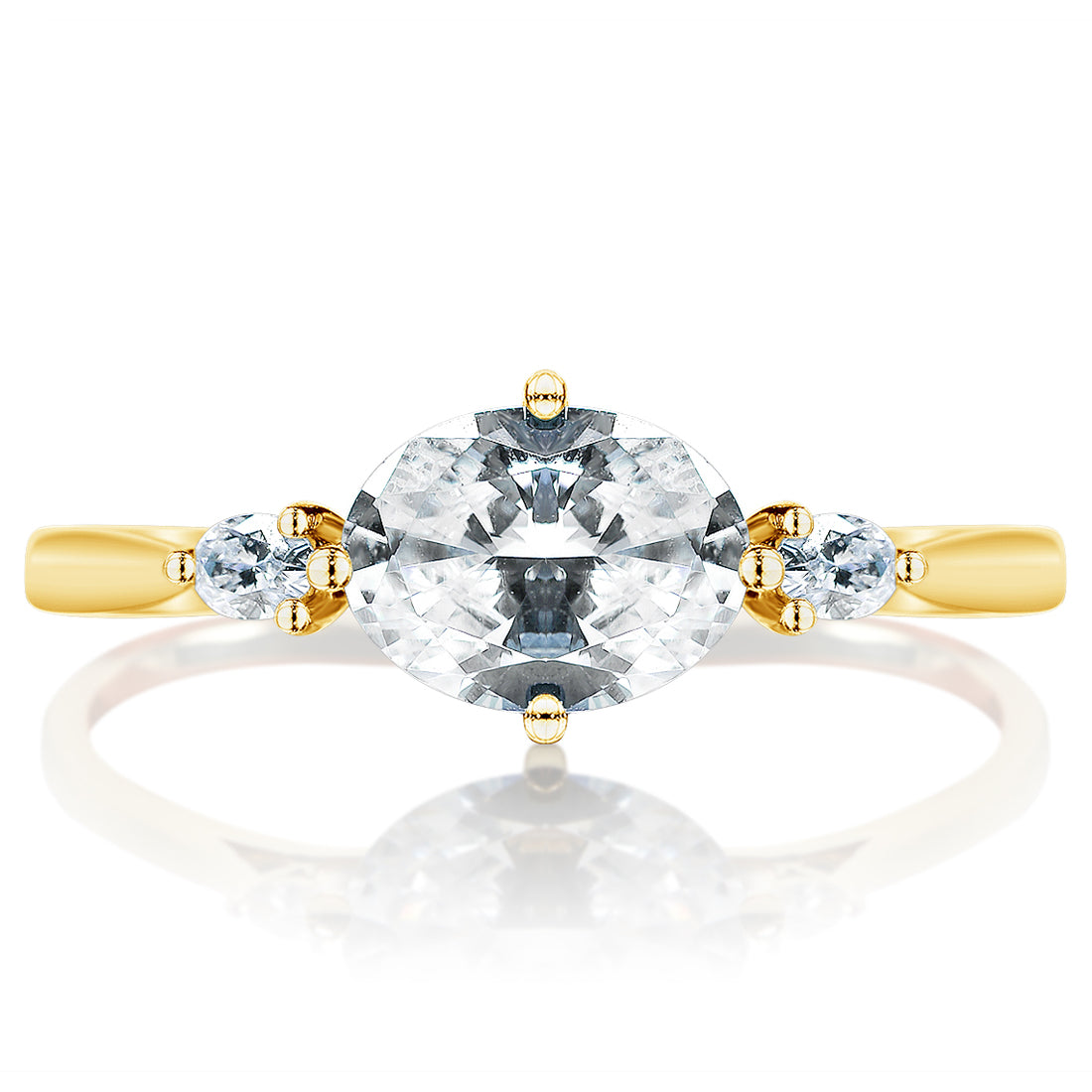 A modern twist on a timeless style. This east-west three-stone ring puts a fresh spin on the classic past, present, and future design with sleek, sophisticated flair. Three oval stones, renowned for their elegant allure, shine horizontally atop a yellow gold band—each one symbolizing a chapter of your love story. It's a meaningful piece with eye-catching edge, expertly blending modern elegance with meaningful sentiment.