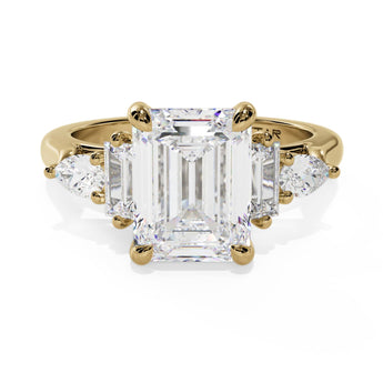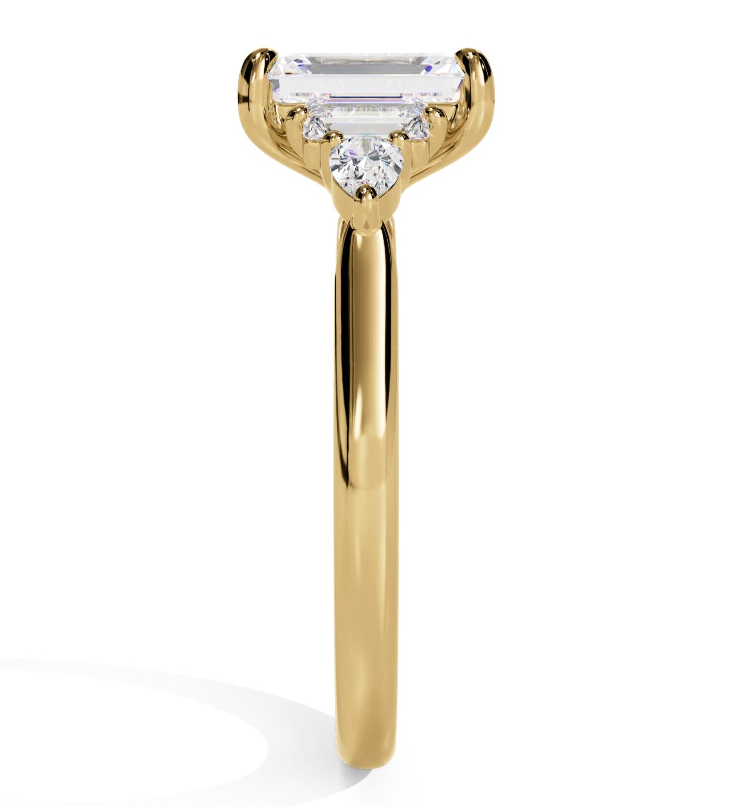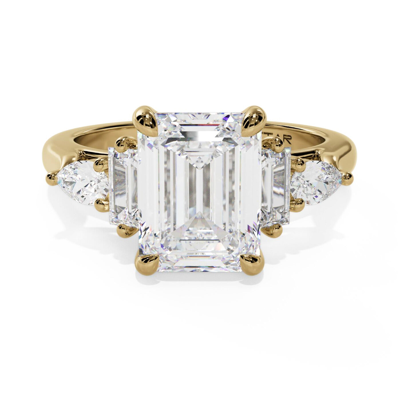 Striking and sophisticated, this engagement ring is designed to turn heads. A grand emerald-cut center takes the spotlight, framed by straight baguette and pear-shaped side stones that draw the eye inward and amplify the stone’s hall-of-mirrors brilliance. Crafted in warm yellow gold, the setting blends modern glamour with timeless elegance. The three-stone design celebrates your past, present, and future together, making it as meaningful as it is unforgettable. Plus, its high-polish shank delivers a traditional yet practical look that pairs perfectly with its matching wedding band!