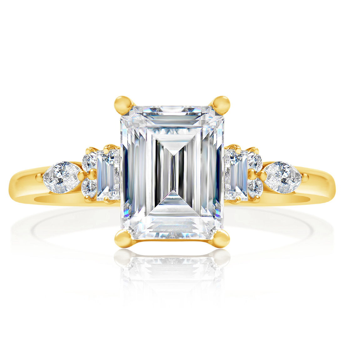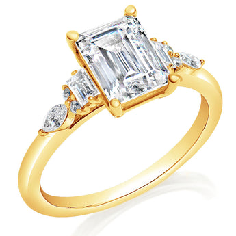 Modern romance, reimagined. This captivating engagement ring features an emerald-cut center stone, renowned for its sleek allure, set in warm yellow gold for a timeless yet contemporary feel. A glittering arrangement of baguette, round, and pear-shaped stones decorate its cathedral shoulders, add playful sparkle and vintage-inspired charm. Elegant, structured, and effortlessly chic, this piece is made for the modern bride who loves a little drama.