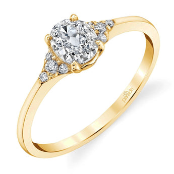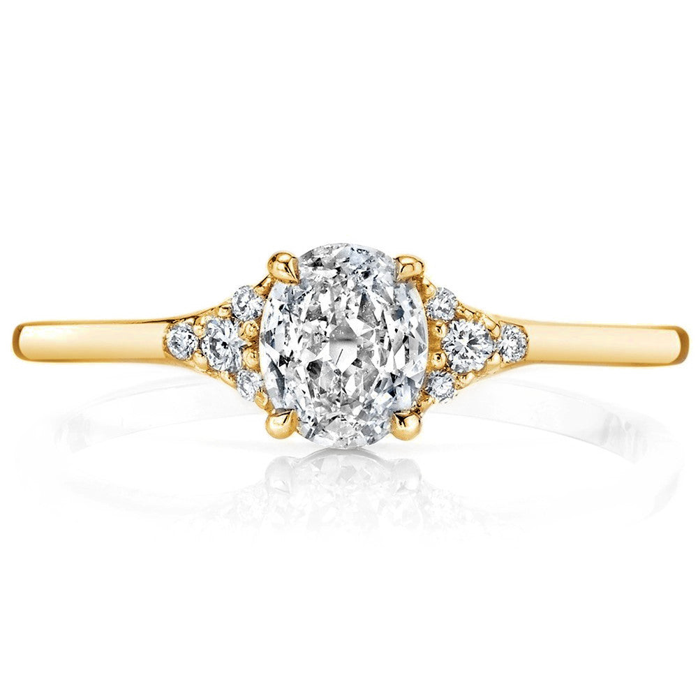 This dainty and feminine engagement ring gets a dazzling update! Clusters of glittering round diamonds set along the shoulders of the ring frame a gleaming oval center stone. The shining gold band pairs beautifully with a variety of wedding band styles, letting you create the wedding set of your dreams!