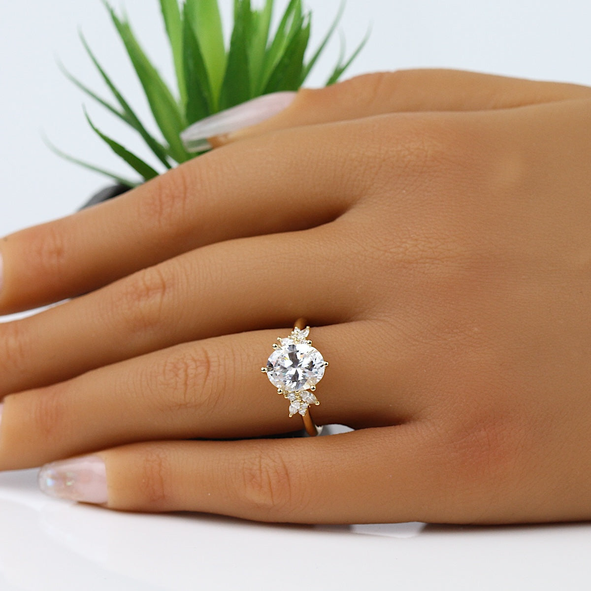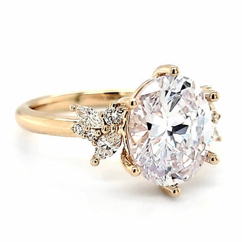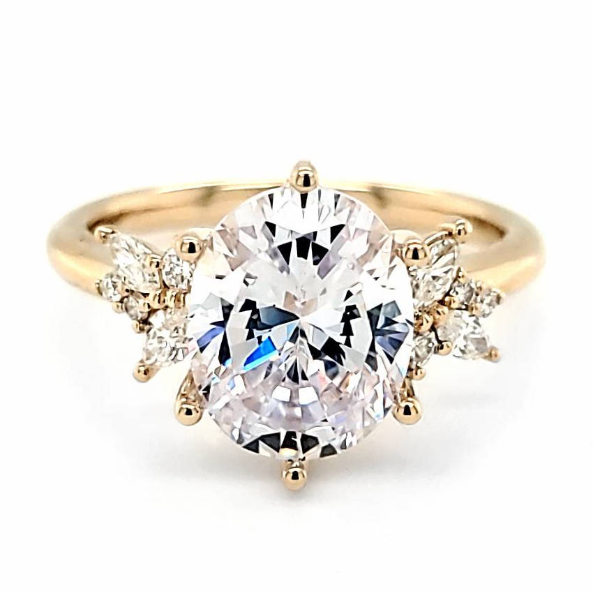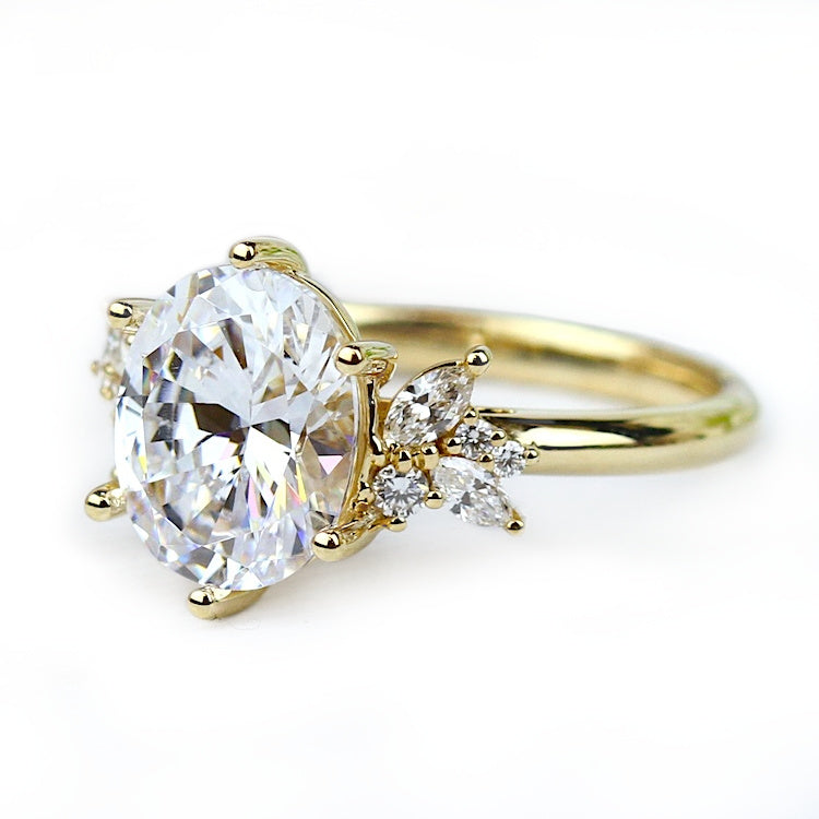Striking clusters of marquise and round diamonds create a palette of fiery brilliance that expertly highlight your lovely oval center stone. The gleaming gold band evokes a sense of timeless beauty and is versatile to pair with many wedding band styles.
