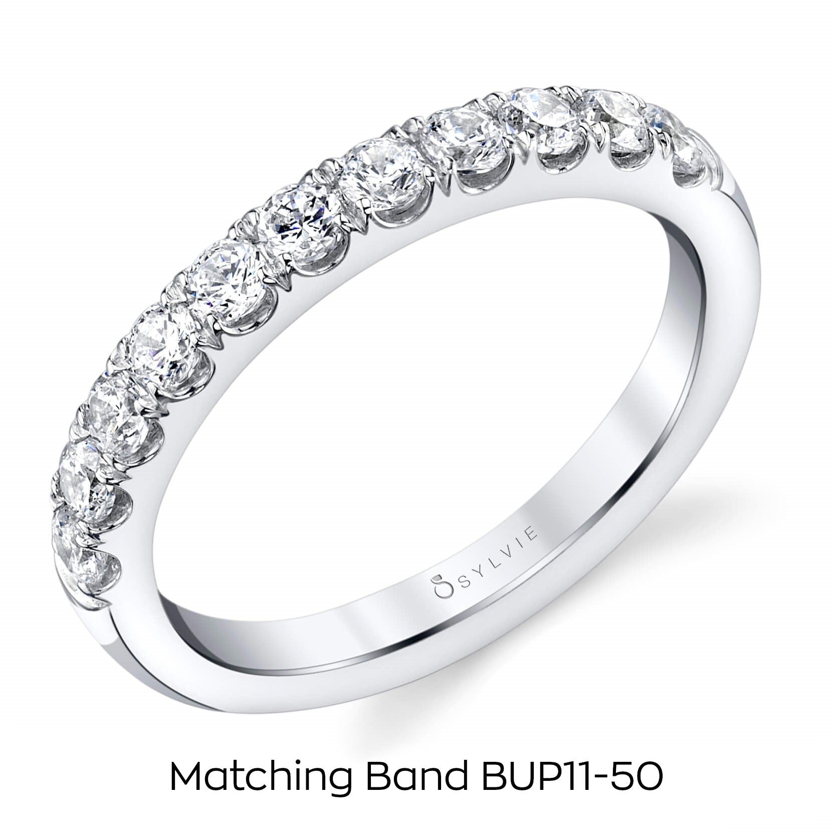 This sparkling classic engagement ring features a round center stone shining bright in four prongs. Illuminating the band are prong-set diamonds flowing halfway down. Pair this beauty with its matching wedding band to create a bold and timeless wedding set.