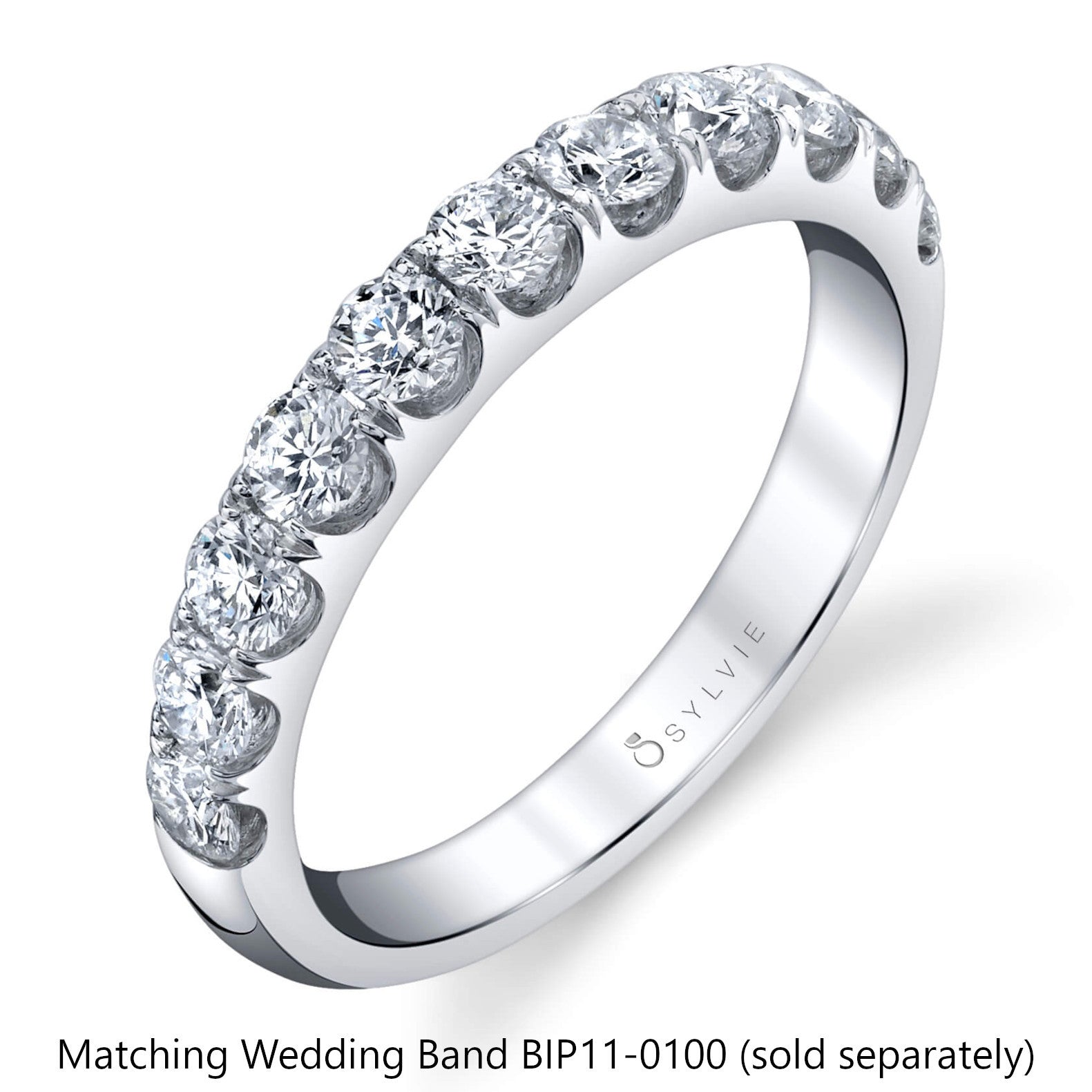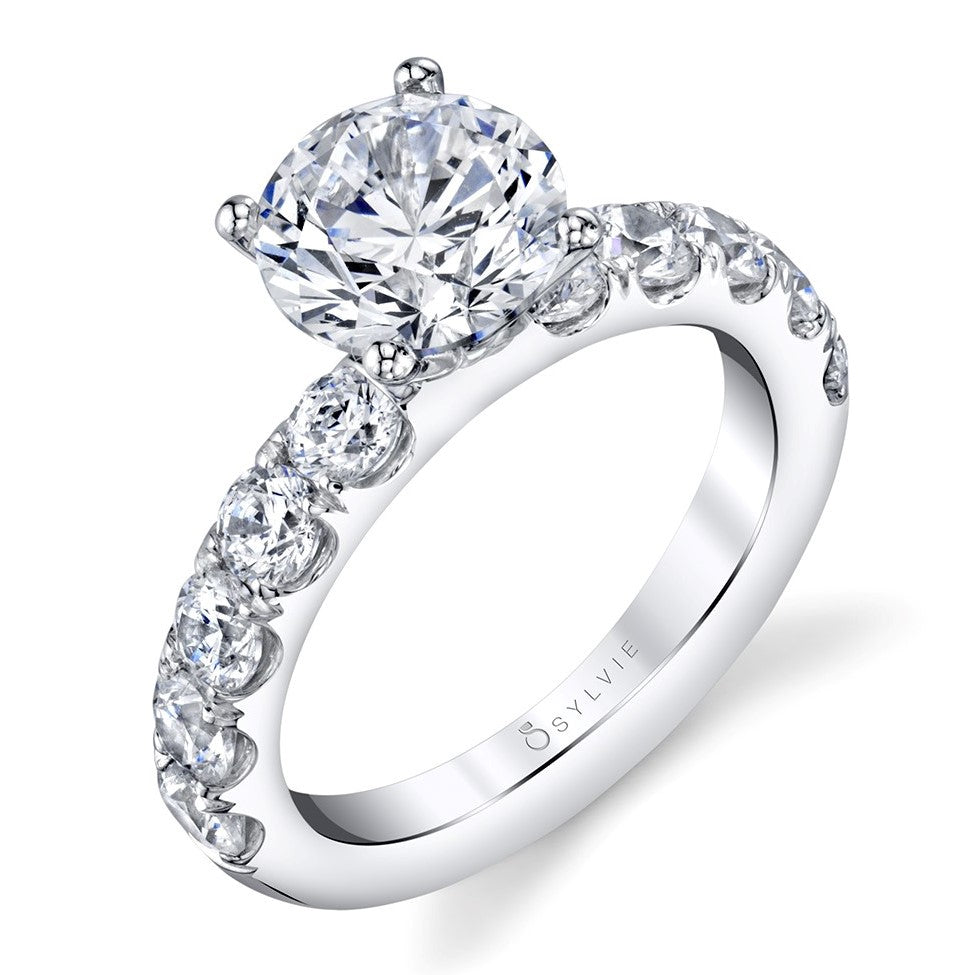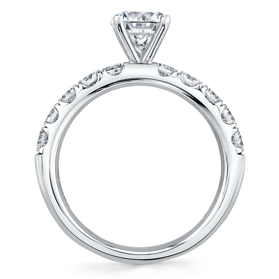 This sparkling classic engagement ring features a round center stone shining bright in four prongs. Illuminating the band are prong-set diamonds flowing halfway down. Pair this beauty with its matching wedding band to create a bold and timeless wedding set.