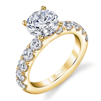This sparkling classic engagement ring features a round center stone shining bright in four prongs. Illuminating the band are prong-set diamonds flowing halfway down. Pair this beauty with its matching wedding band to create a bold and timeless wedding set.