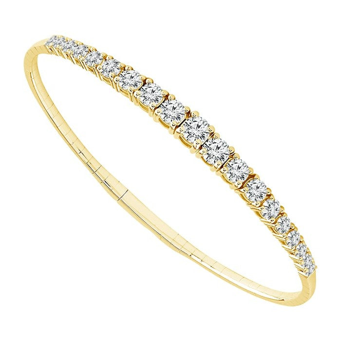 Indulge in the sheer luxury of this graduate diamond flexi bangle bracelet. Expertly crafted in yellow gold, this bracelet utilizes a clever titanium filament core that ensures both flexibility and unparalleled comfort. A stunning array of round diamonds gracefully graduate towards the center, exuding timeless beauty and eye-catching allure. Undeniably enchanting when worn solo, this bangle truly comes to life when paired with others - so go ahead! Mix and match to create a dazzling bracelet stack that's uniquely yours!