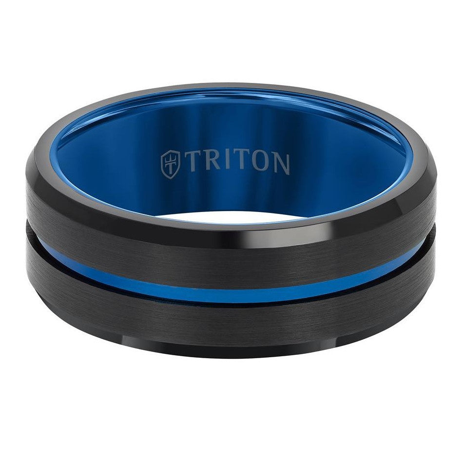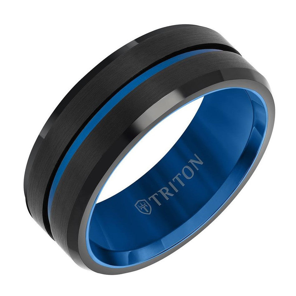 Experience a fusion of strength, contemporary style, and exceptional comfort with this 8mm-wide black tungsten wedding band. With its brushed finish and polished beveled edges, this ring exudes bold sophistication and modern allure. A center stripe of striking blue tungsten circles the band, adding a pop of color and symbolizing the depth of your love. The slightly rounded interior makes it perfect for all-day wear on your special day and beyond.