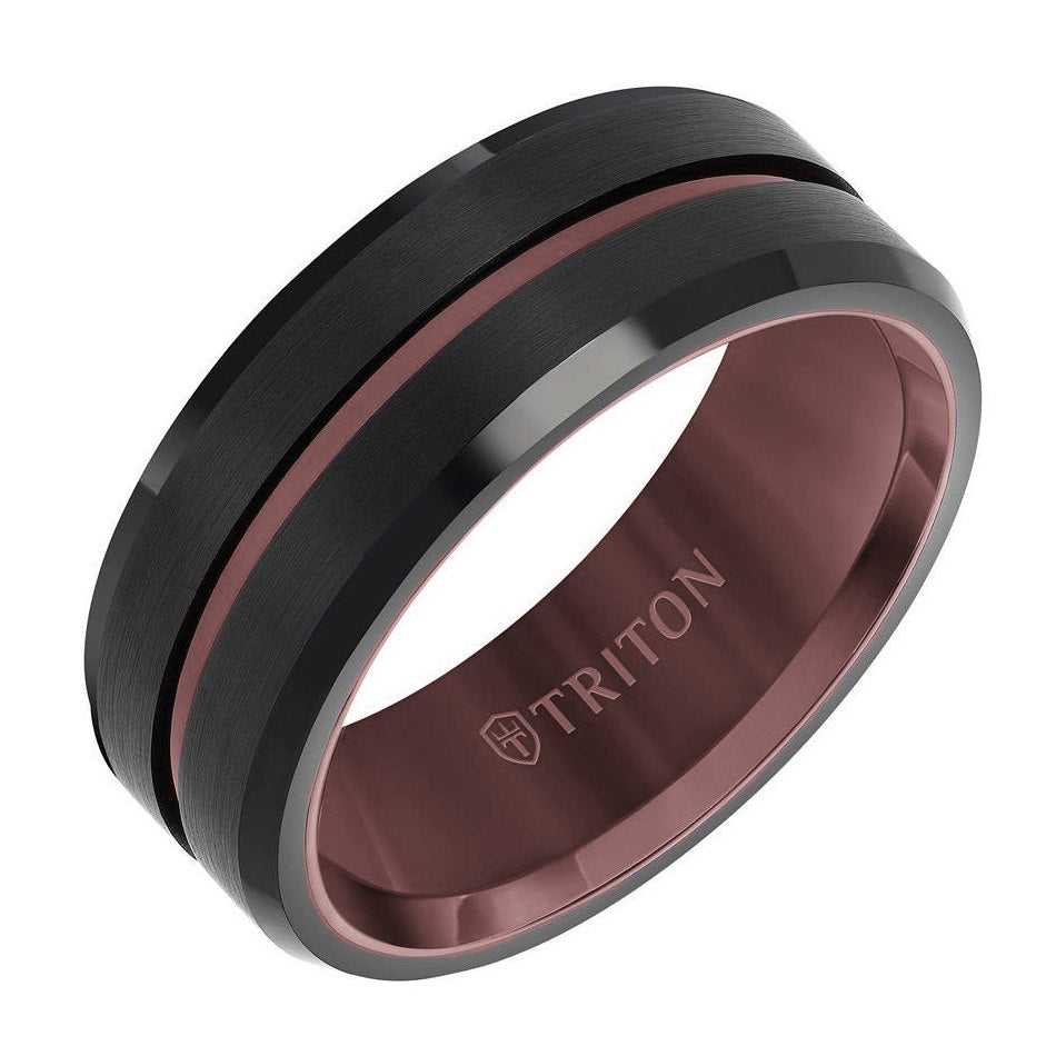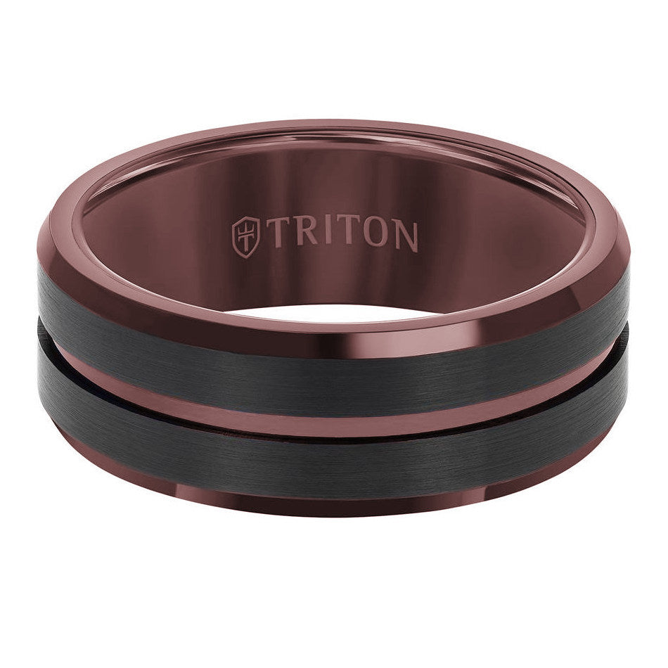 Experience a fusion of strength, contemporary style, and exceptional comfort with this 8mm-wide black tungsten wedding band. With its brushed finish and polished beveled edges, this ring exudes bold sophistication and modern allure. A center stripe of espresso brown tungsten circles the band, adding some warmth and symbolizing the depth of your love. The slightly rounded interior makes it perfect for all-day wear on your special day and beyond.