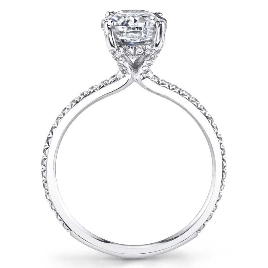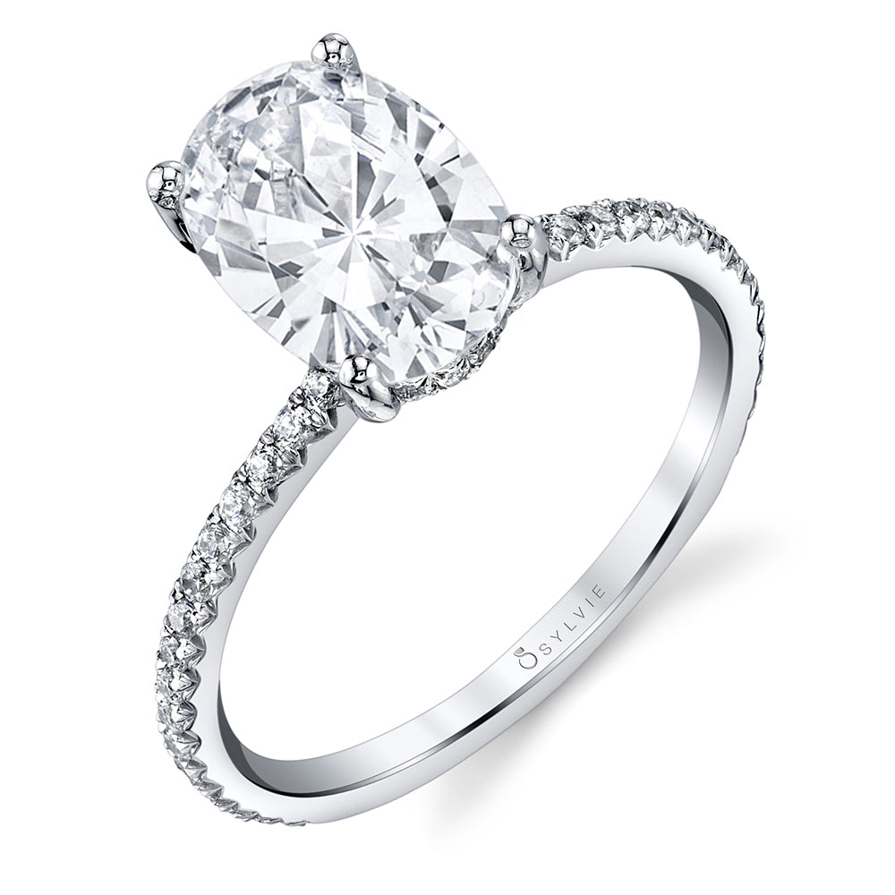 This enchanting engagement ring features a brilliant oval center stone, shining bright atop a shank of shimmering prong-set diamonds. The crown that holds the center dazzles with a hidden halo of even more diamonds, sparkling from all angles. Customize it with any size or shape center stone you prefer to create your dazzling dream ring!