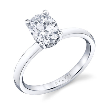 This enchanting engagement ring showcases a brilliant oval center stone, sparkling atop a shiny, high-polished shank. The crown cradling the center glitters with a hidden halo of diamonds, adding a touch of extra glamour from every angle. Customize this beauty with your preferred size or shape center stone to create the dazzling ring of your dreams!