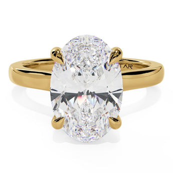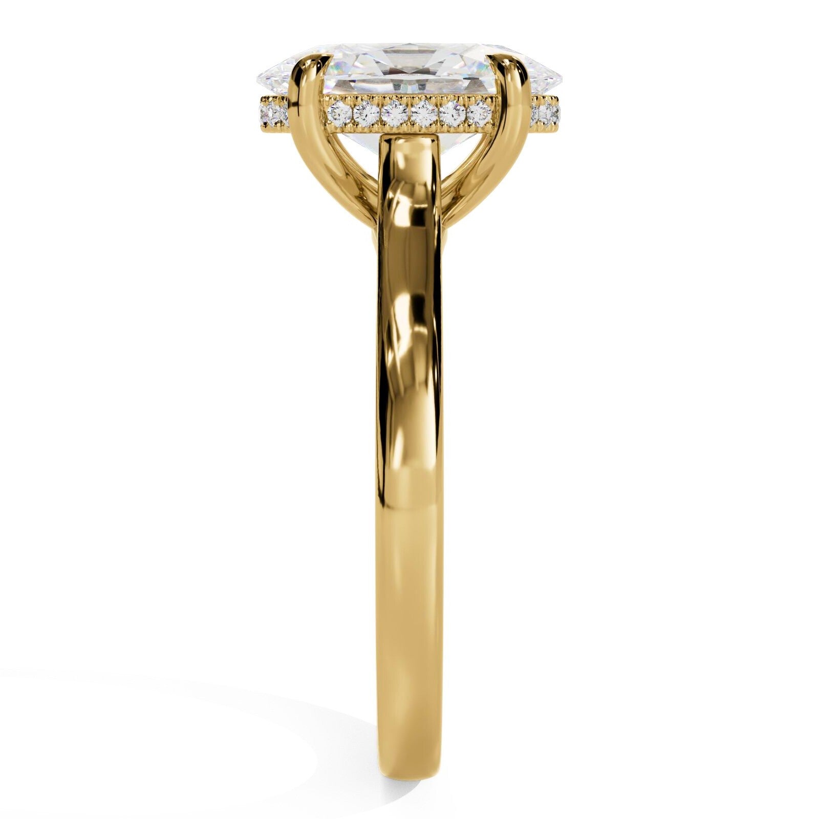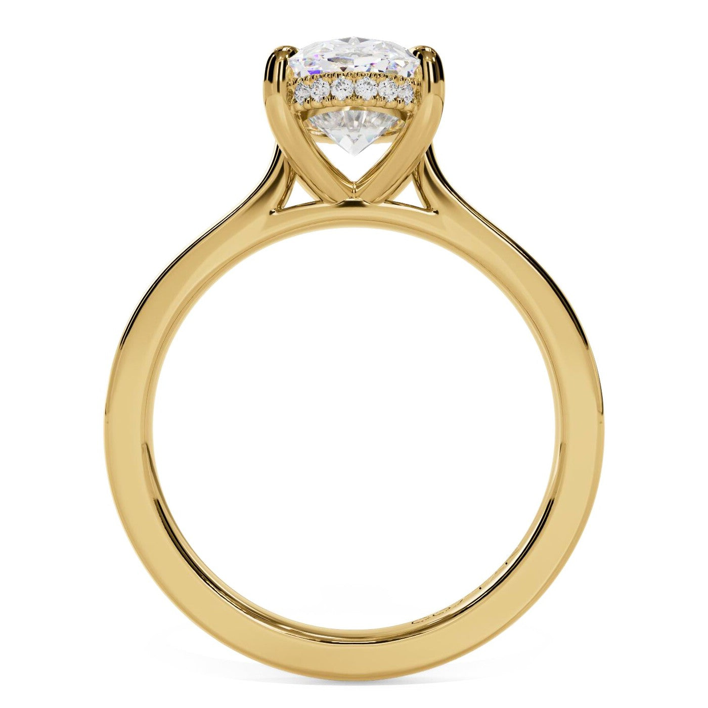 This gorgeous, cathedral-style engagement ring showcases an alluring oval center stone atop a band of gleaming gold. A hidden halo of glittering accent diamonds decorates the crown holding your center, creating a dazzling display from every angle. Its shiny polished shank makes for a clean and timeless look that’s versatile enough to pair with virtually any wedding band.
