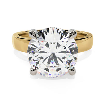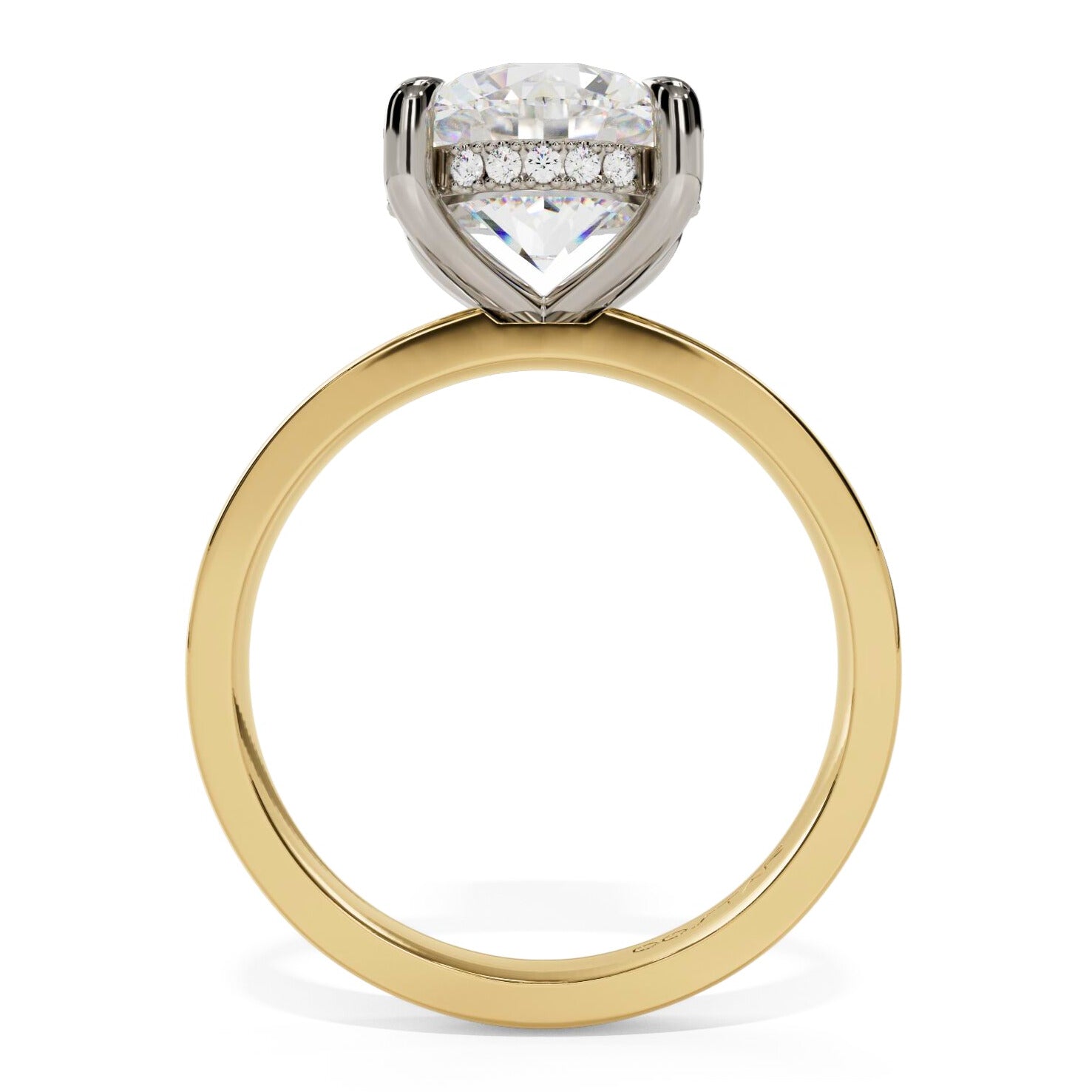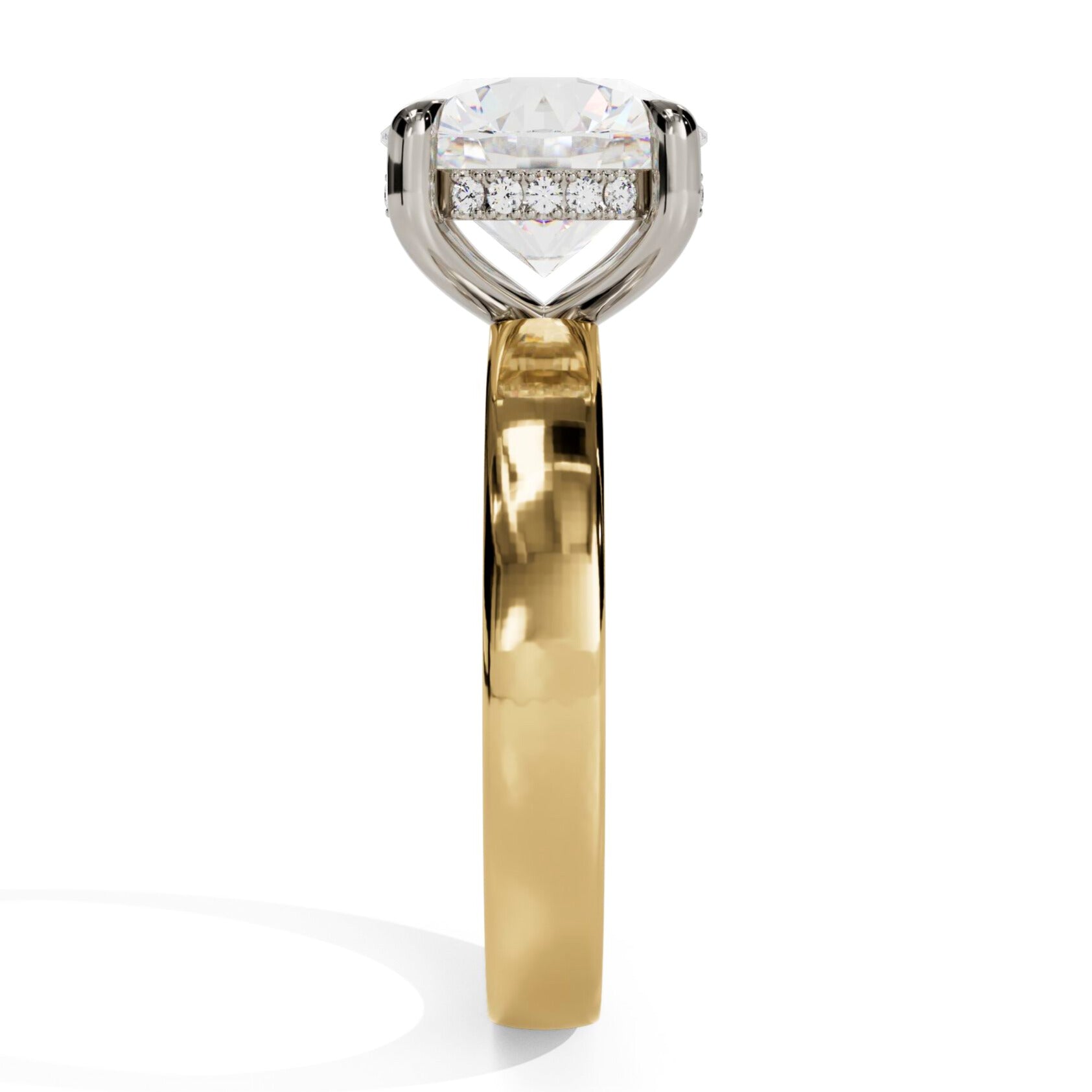 The chic, wide band of this modern engagement ring sets a luxurious stage for your dazzling round center stone to sit ato. a hidden halo of diamonds glitters beneath the center stone, adding glamour to every angle. a symbol of everlasting commitment that's as bold as your love. plus, its shiny shank pairs seamlessly a variety of wedding band styles, letting you easily create your dream wedding set!